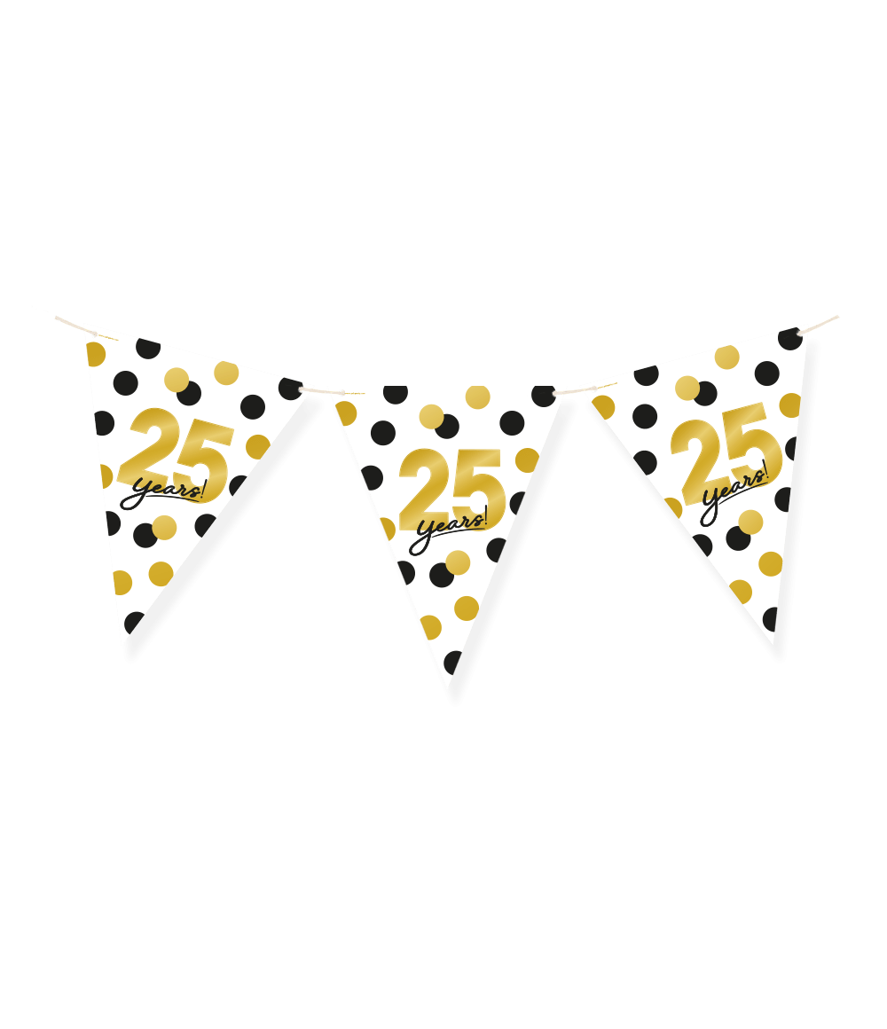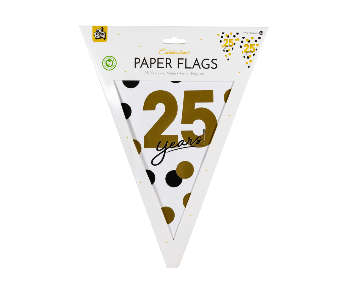 Papirflagene Celebration! papirflag - 25 er de perfekte flag til at pifte en fest op for en 25-årig! Denne flagserie skiller sig ud med sit karakteristiske design, og fordi flagene er lavet af papir, tænker du også på miljøet! Papirflagene er 6 meter lange. Kombiner dem med de matchende celebration! balloner!