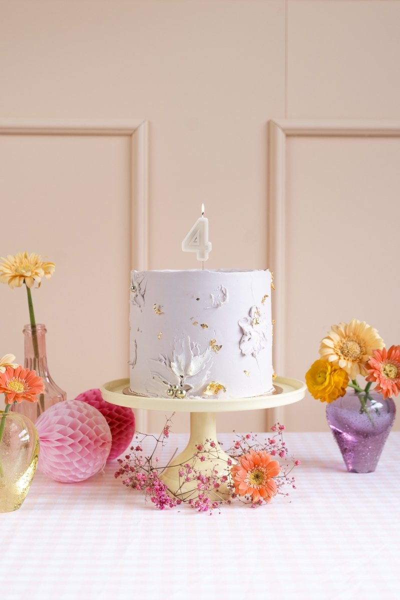 Fødselsdagslys nummer 4 i beige, højde lys ca. 6 cm, højde lys med pind ca. 10 cm.