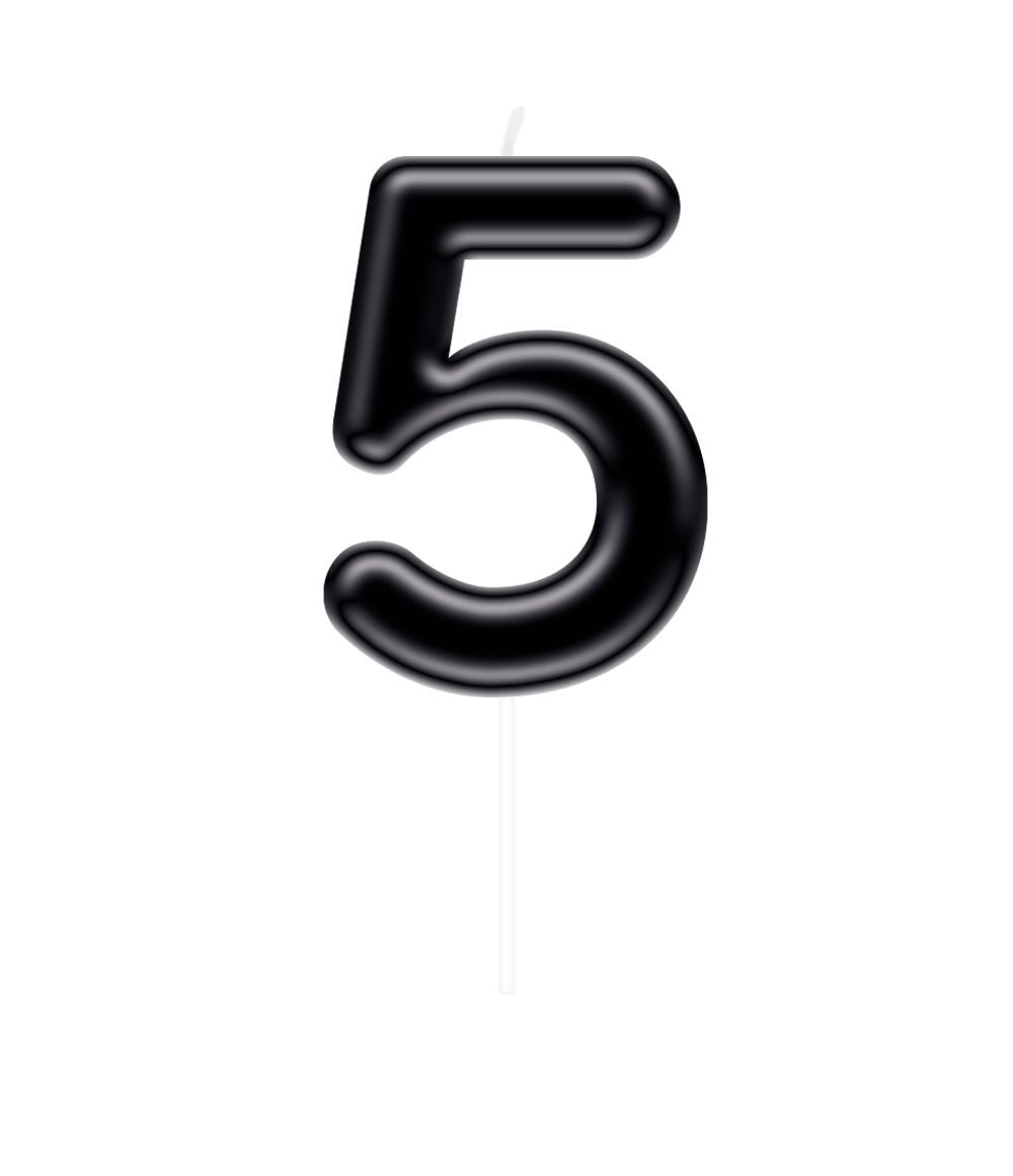 Fejr hver milepæl med stil med dette sorte tallys "5". Perfekt til at markere aldre, jubilæumsnumre eller andre særlige lejligheder. Den sorte farve får lyset til at skille sig ekstra ud på enhver kage eller cupcake.