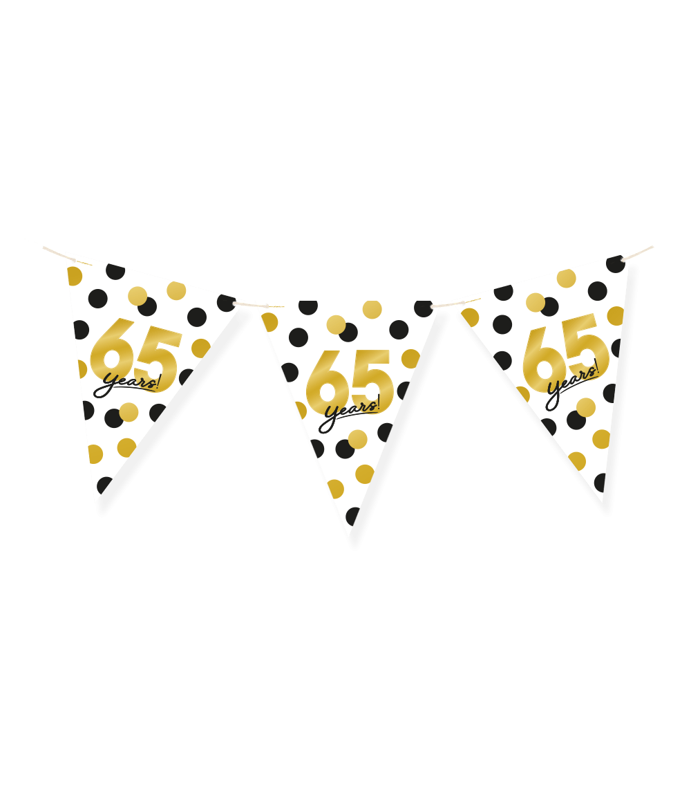 Papirflagene Celebration! papirflag - 65 er de perfekte flag til at pifte en fest op for en 65-årig! Denne flagserie skiller sig ud med sit karakteristiske design, og fordi flagene er lavet af papir, tænker du også på miljøet! Papirflagene er 6 meter lange. Kombiner dem med de matchende celebration! balloner!