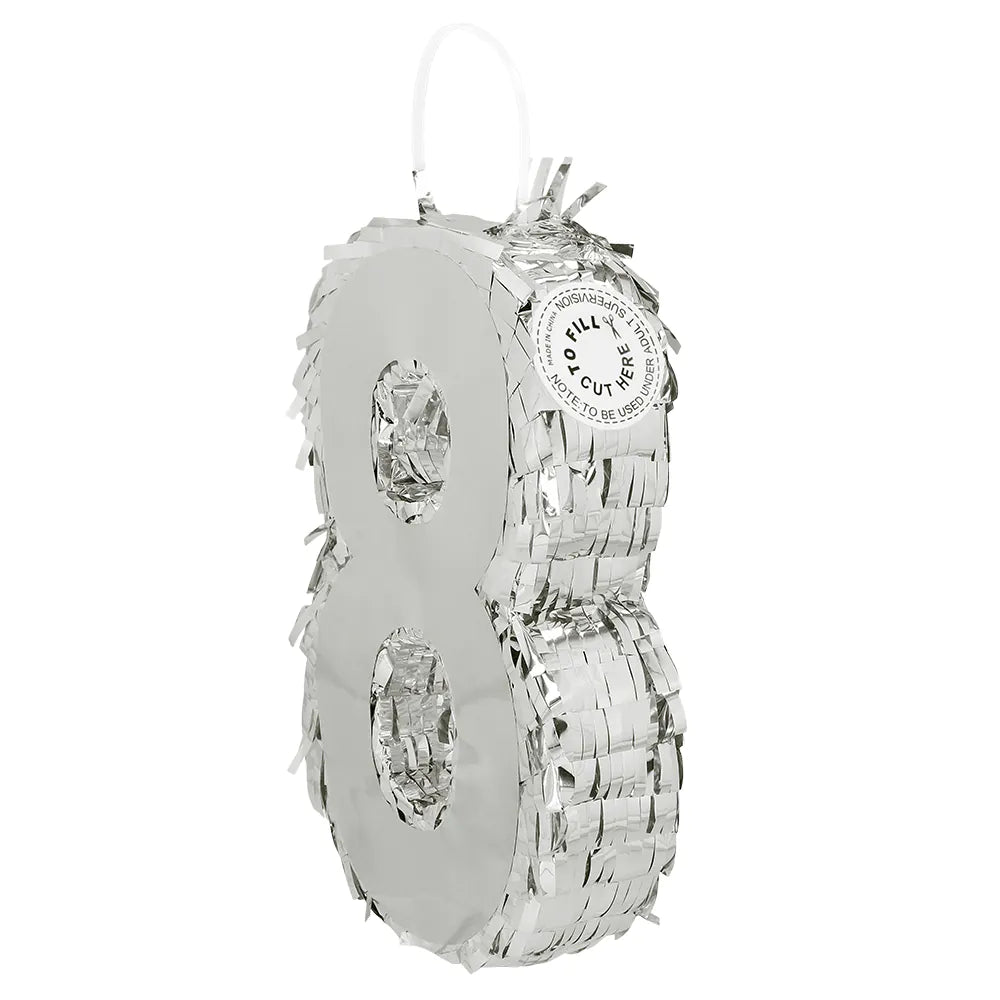 Denne fantastiske sølvpinata i form af tallet '8' er perfekt til at fejre milepæle og særlige lejligheder. Med sine 25 cm vil den med garanti være et blikfang til enhver fest.