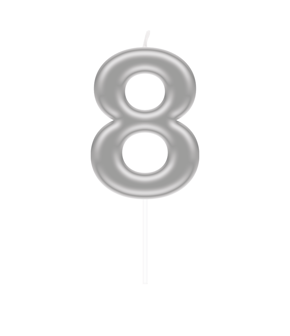 Fejr enhver milepæl med stil med dette sølvfarvede tallys "8". Perfekt til at markere aldre, jubilæumsnumre eller andre særlige lejligheder. Den skinnende sølvfarve får lyset til at skille sig ud på enhver kage eller cupcake.