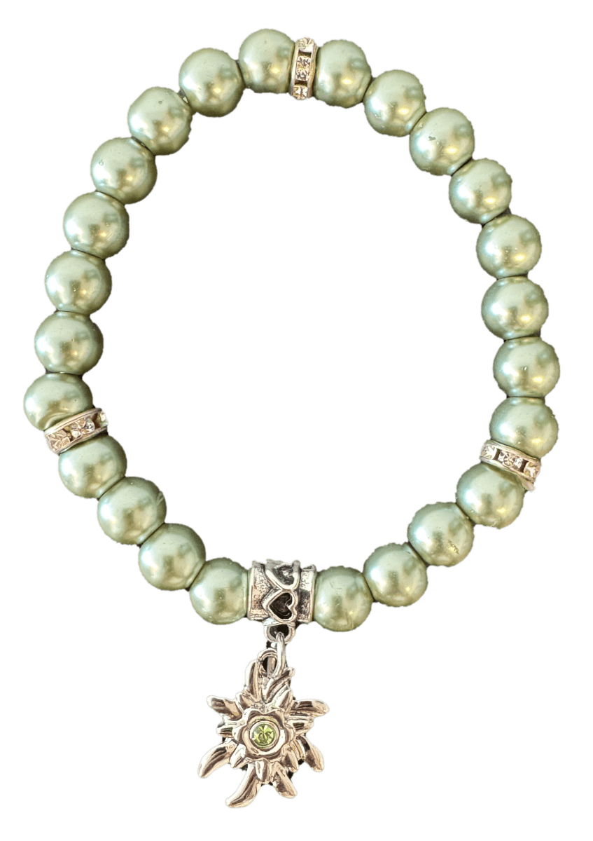 Tilføj et naturligt og stilfuldt touch til ethvert outfit med dette grønne armbånd med perler og edelweiss. Det elegante design gør armbåndet velegnet til hverdagsbrug eller som en særlig gave.
