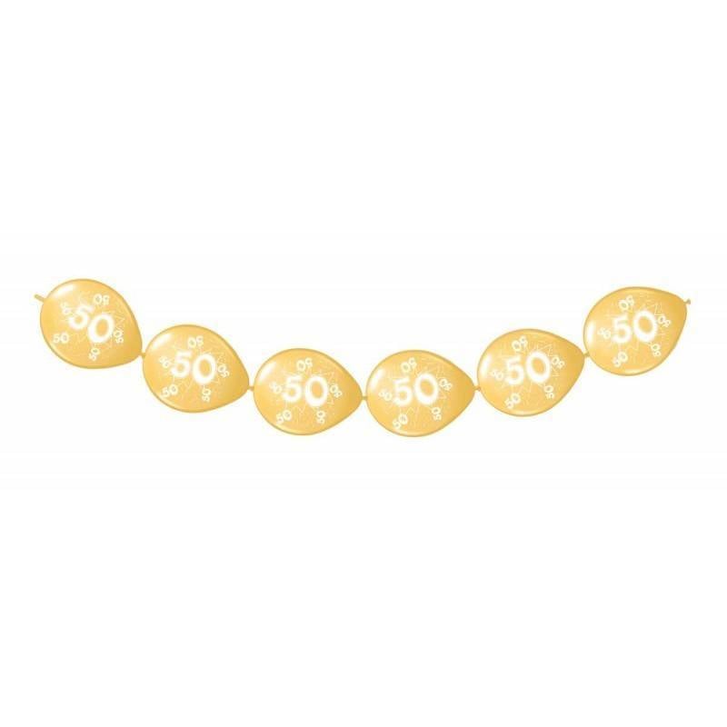 50 års jubilæumsballoner med knap - 3 meter. Indhold: 8 latexballoner. Kan f.eks. bruges til følgende fester/anledninger: jubilæum, fødselsdag. Guirlanden er 3 meter lang, og de 8 balloner er 10 tommer/25 cm. Varen er lavet af latex.