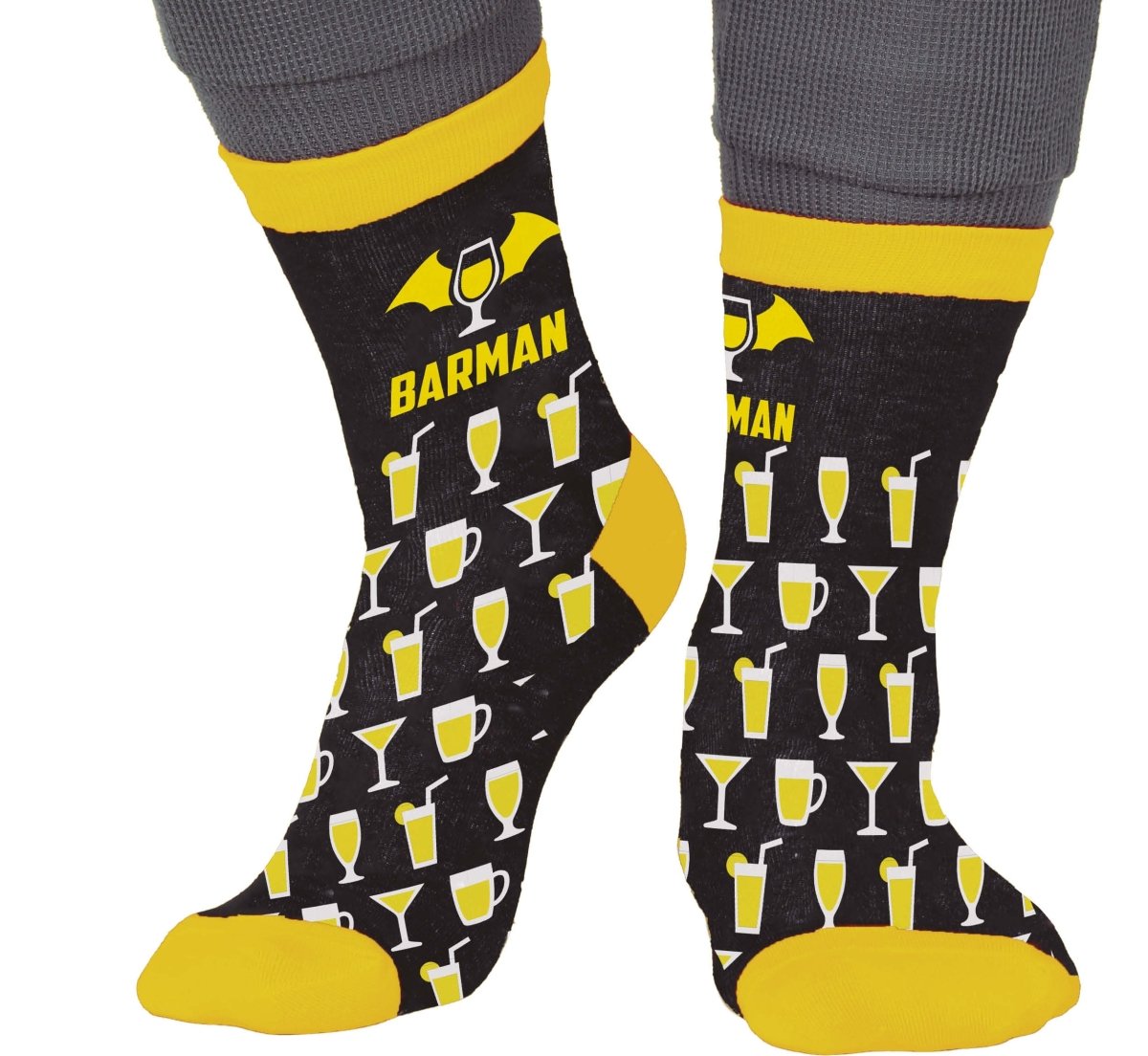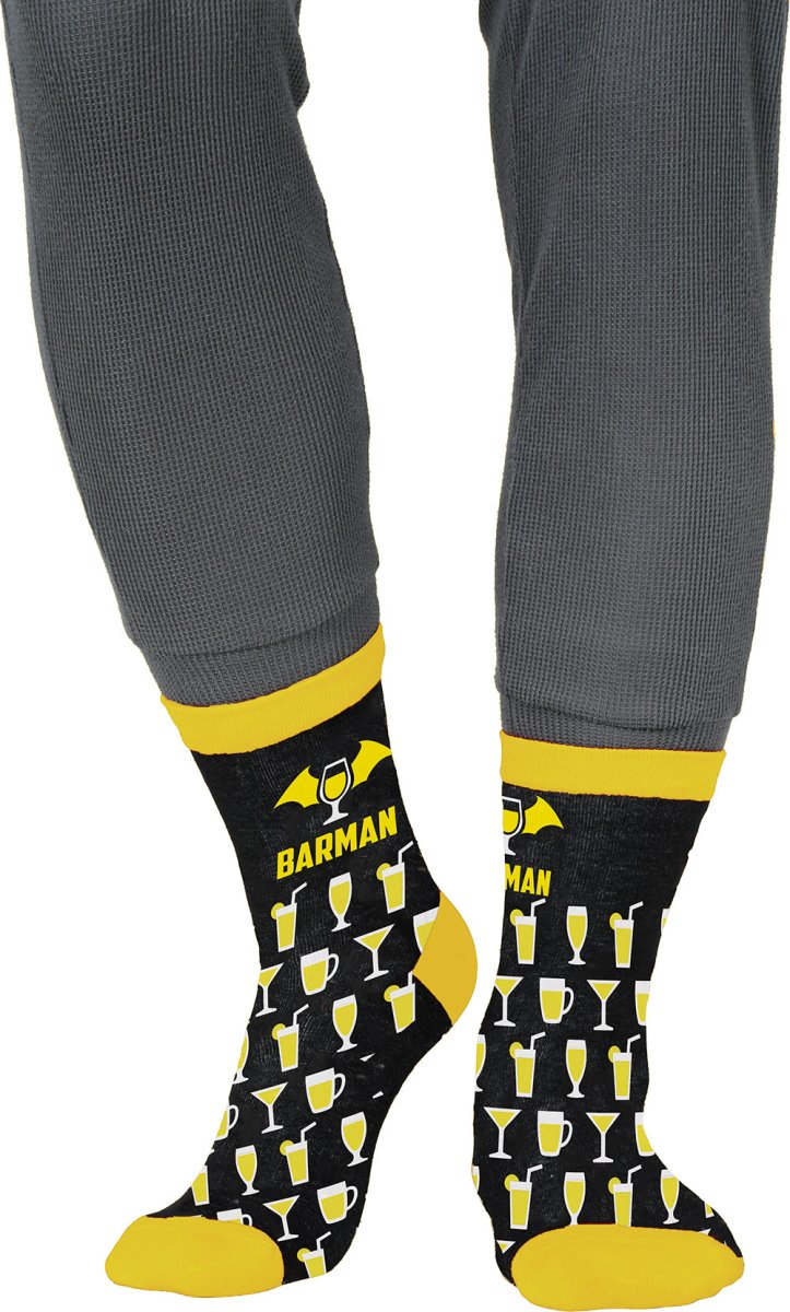 Stilfulde og behagelige sokker i sort og gul, perfekte til hverdagsbrug eller som en fin gave til bartendere og barkvinder.