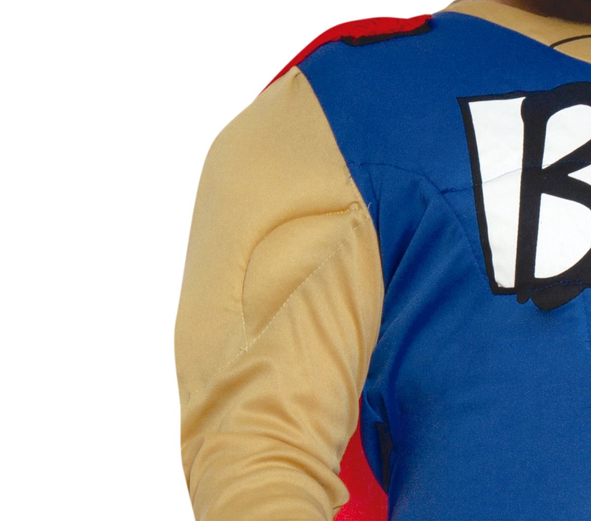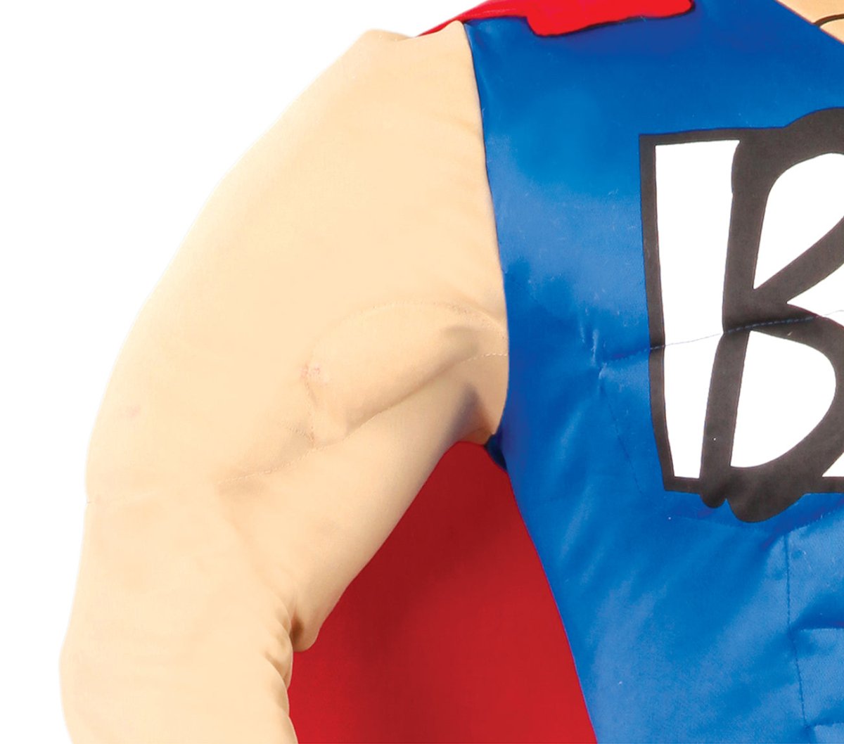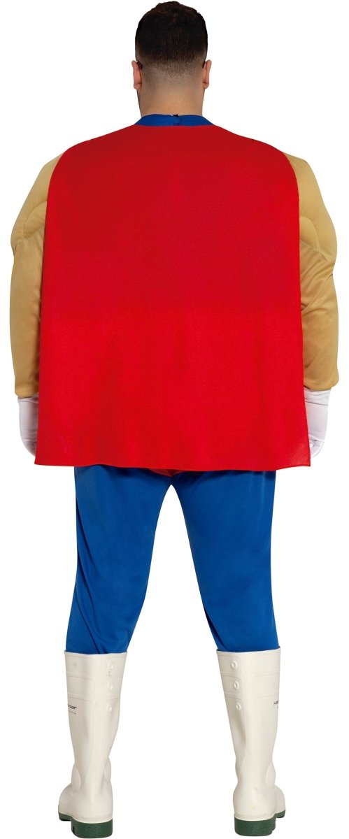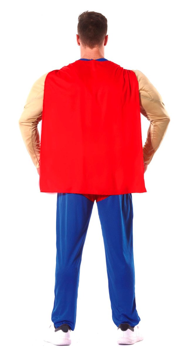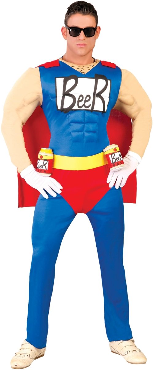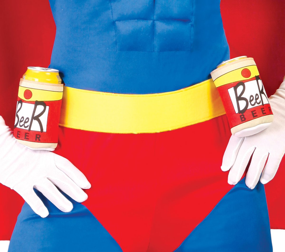 Indhold: superhelte-jumpsuit med kappe, bælte med øldåser