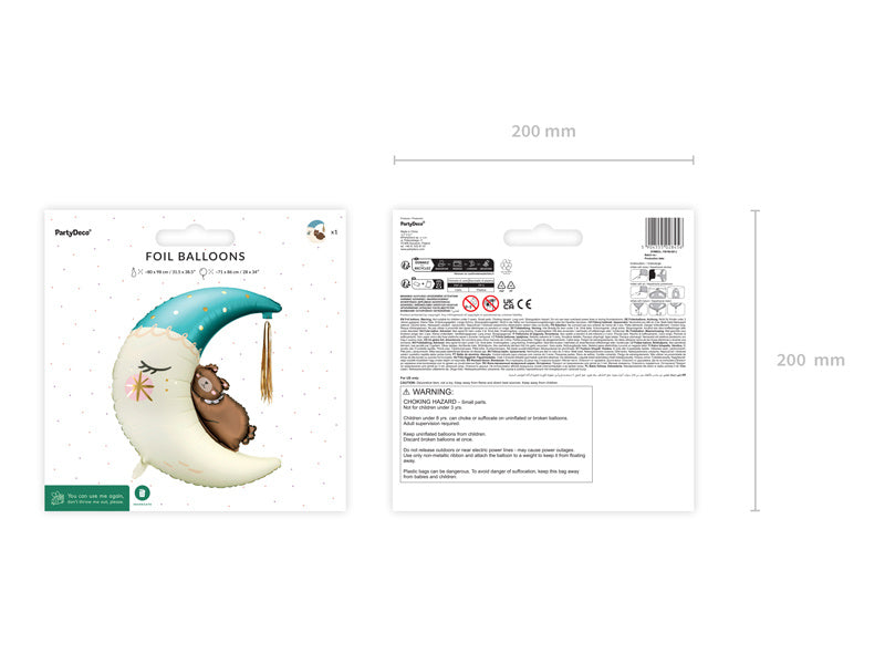 Folieballon Teddy Bear on the Moon, farvemix med lyseblåt element og guldkvast, mål før opblæsning ca. 80 x 98 cm, mål efter opblæsning ca. 71 x 86 cm. Pustes op med luft og helium. Sættet indeholder et sugerør og en gylden kvast.