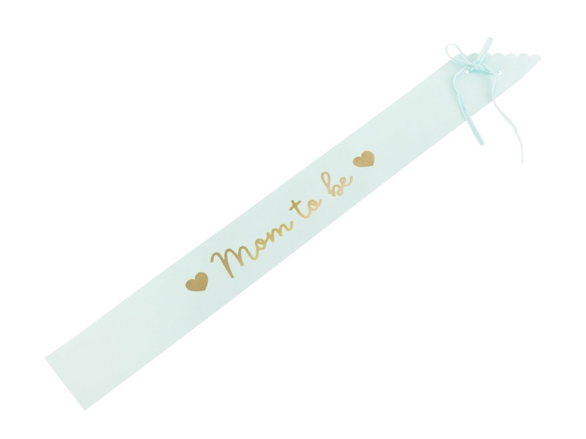 Skærf af lyst tiffanyblåt papir med guldskrift "Mom to be", bredde ca. 9,5 cm, længde ca. 75 cm.