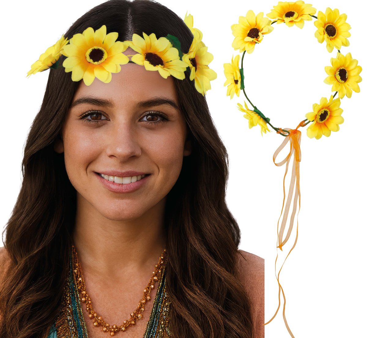 Dette muntre gule blomsterhårbånd er et sjovt tilbehør til udklædningsfester, festivaler eller karneval. Lavet af polyester for komfort og et farverigt, festligt look. Specificaties Pakkens indhold: 1 hårbånd Materiale: polyester Farve: gul Velegnet til: udklædningsfester, temafester, festivaler, karneval, tilbehør