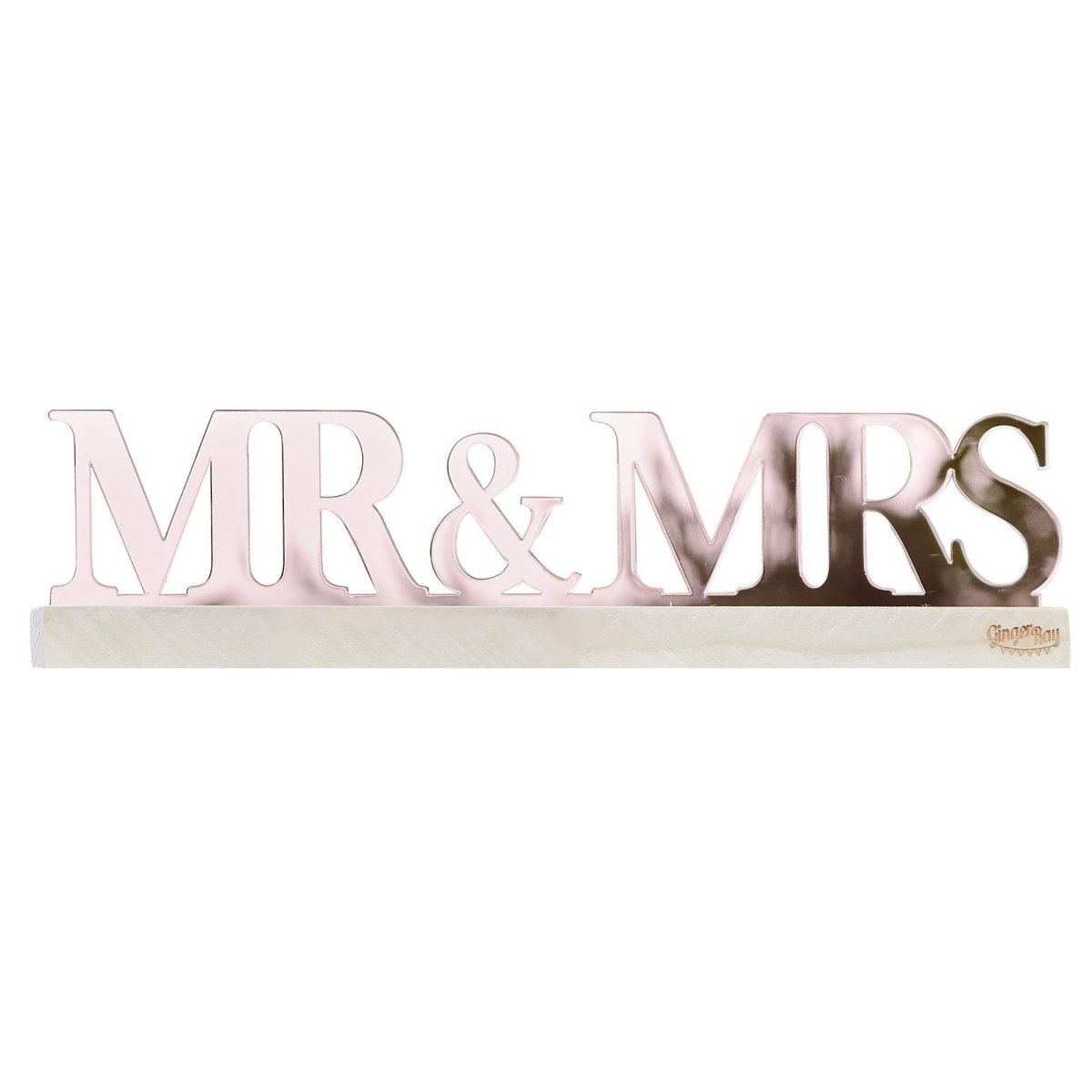 1 x rosaguld akryl 'Mr and Mrs Sign' på en træbase, der måler 30 cm (B) x 7,5 cm (H) x 3,5 cm (D).