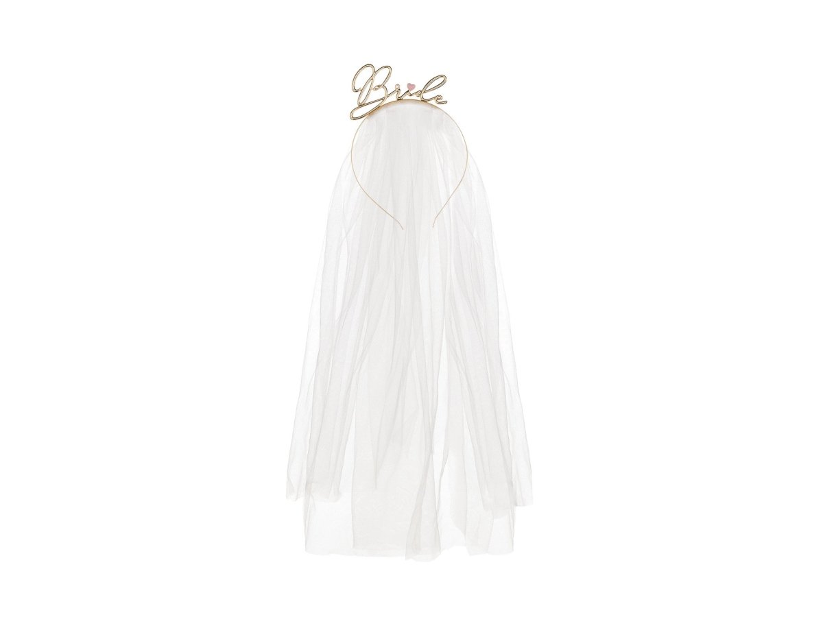 Indhold: Metalpandebånd med inskription Bride i guldfarve og hvidt slør, længde ca. 50 cm.