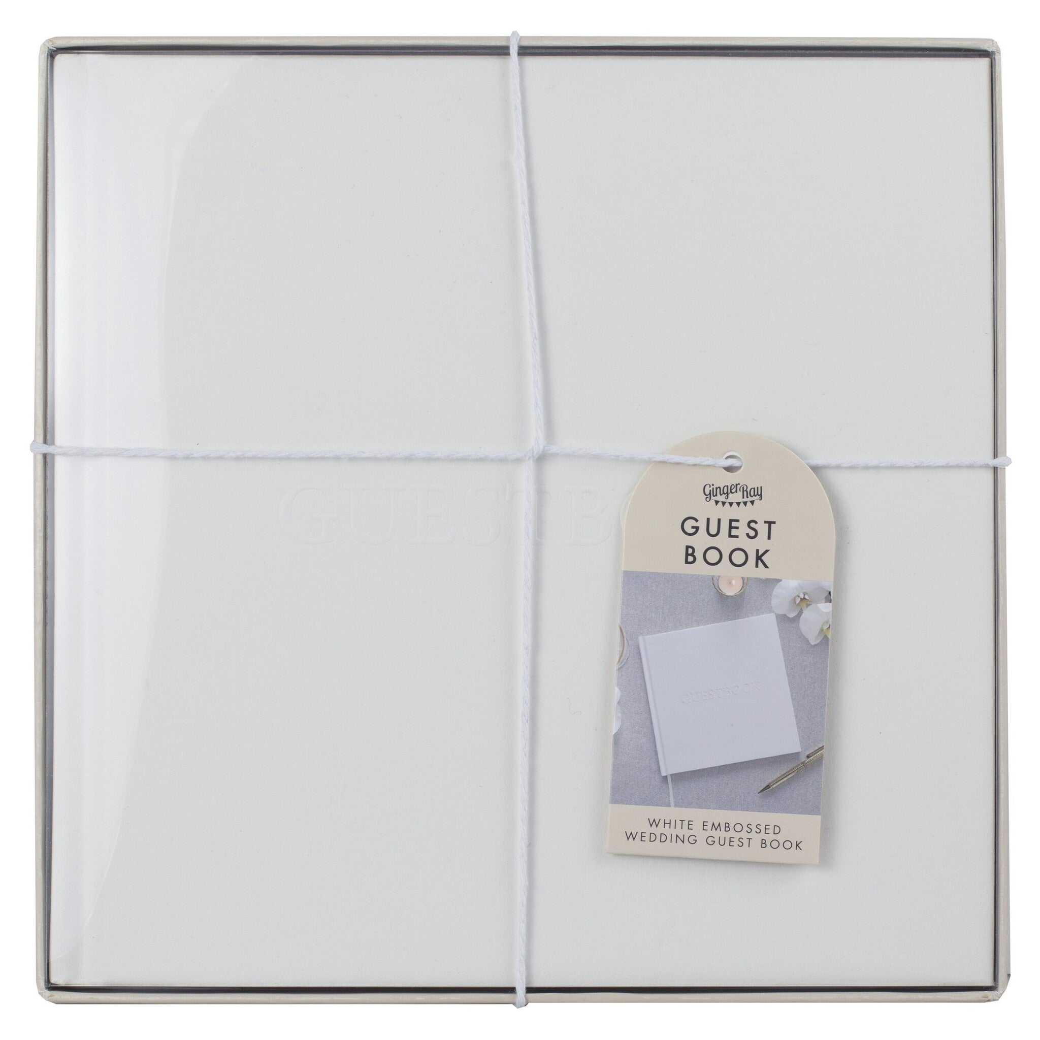 Med 'Guest Book' præget på forsiden, 'Mr &Mrs' i guld på ryggen, sider med guldkanter og et bogmærke med hvidt bånd tilføjer denne bryllupsgæstebog et luksuriøst touch til ethvert moderne bryllup.