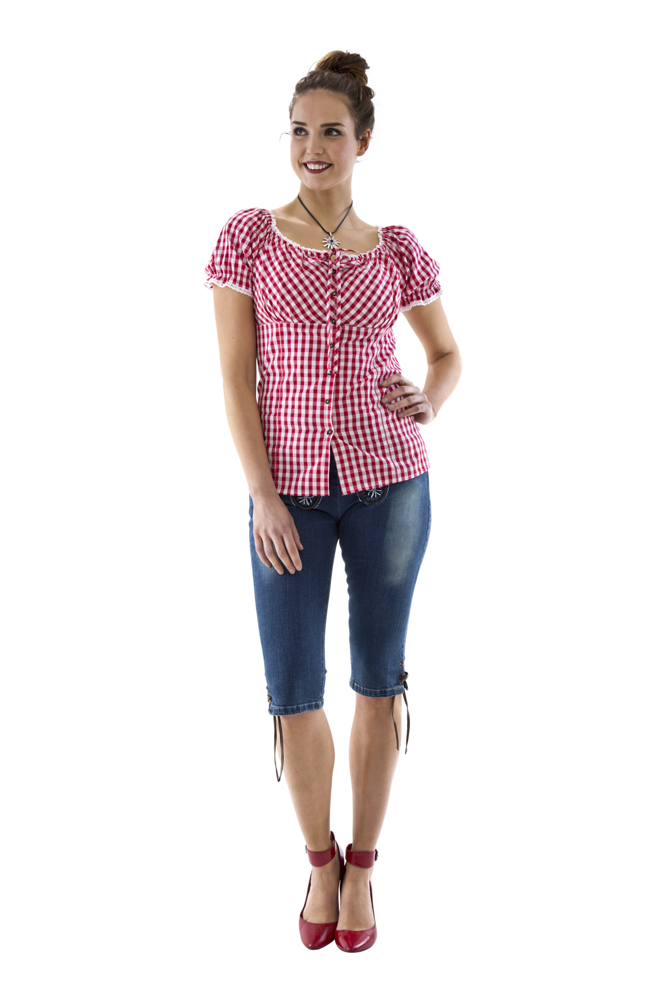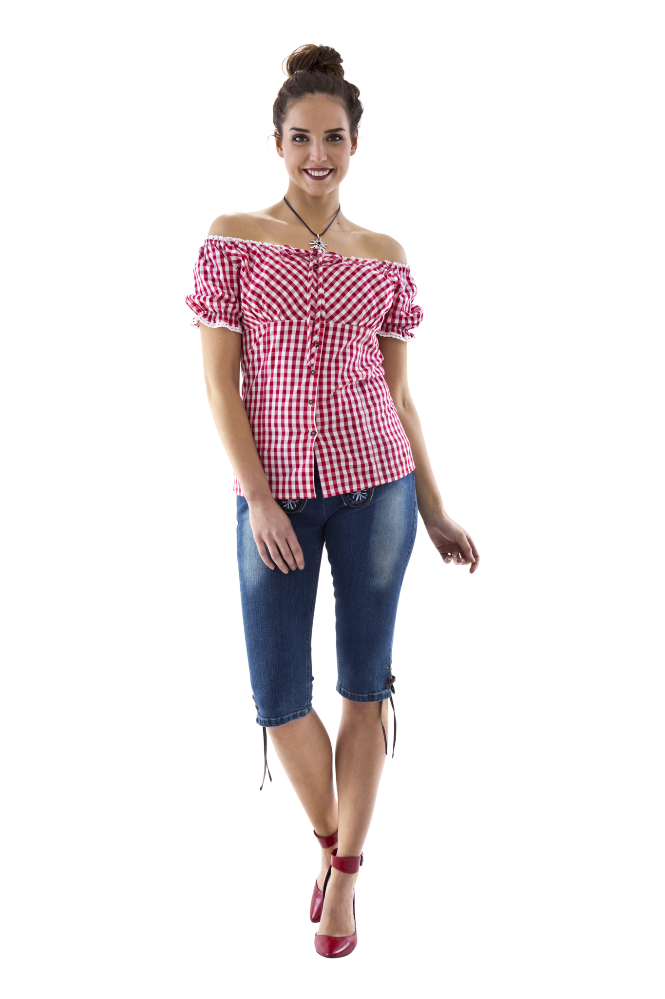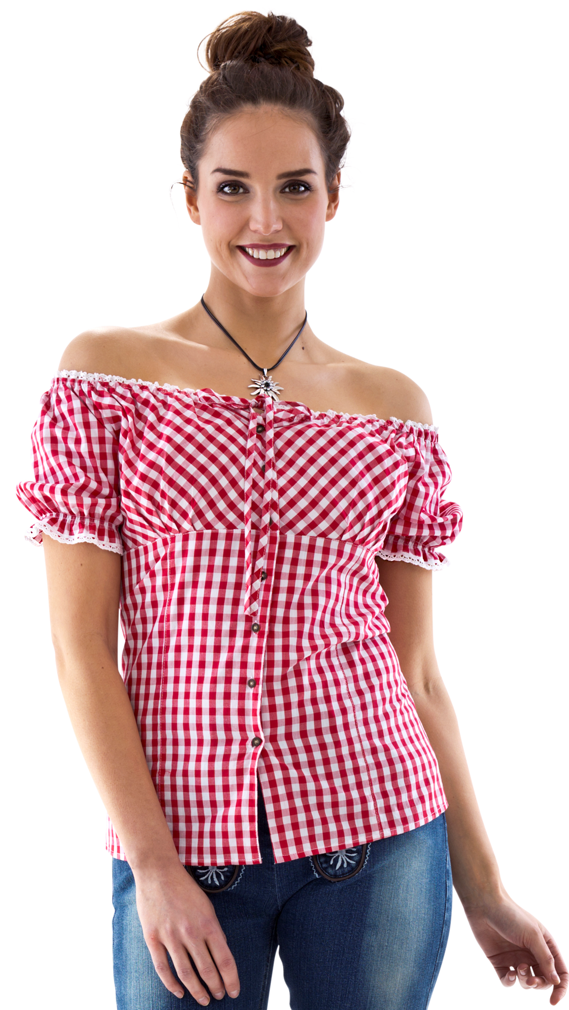 Carmen-bluse rød- og hvidternet, sløjfebånd