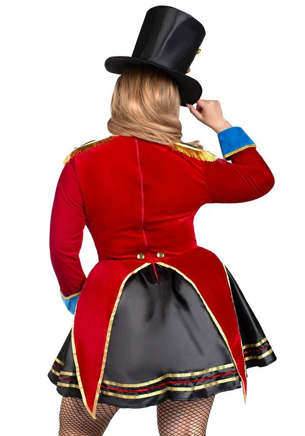 Gør en dristig og uforglemmelig entré med Classic Ringmaster Plus Size-kostumet fra Leg Avenue! Dette show-stoppende kostume har en pailletbesat satinkjole med en stilfuld broderet frakke og en klassisk høj hat. Perfekt til at få alle øjne på dig til fest med halloween-, karnevals- eller cirkustema! 🎭🔥