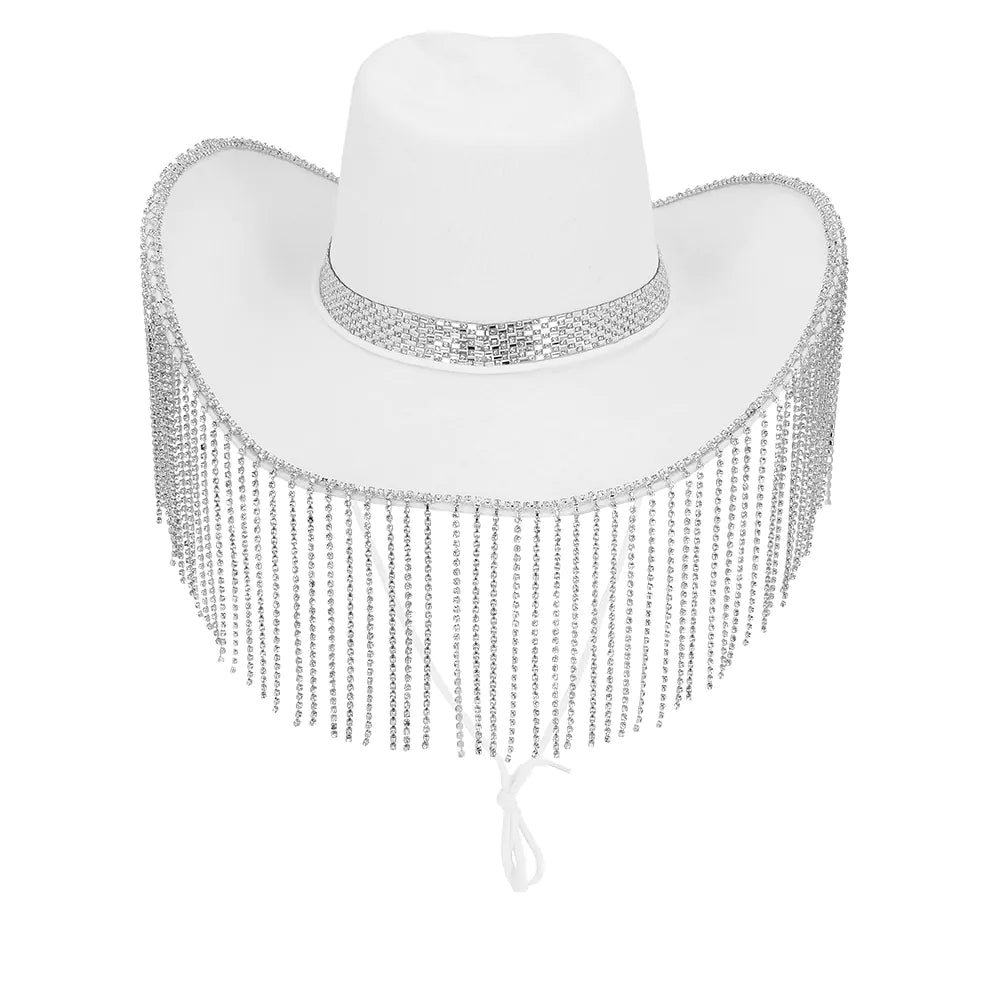 Denne særlige Showgirl-cowboyhat er et unikt tilbehør til et festivaloutfit, et cowboy-karnevalskostume eller en polterabend og tilføjer glamour til det seje westerntema. Den smukke hvide hat har et bånd med skinnende sten og rundt om alle slags skinnende snore for en mystisk effekt.