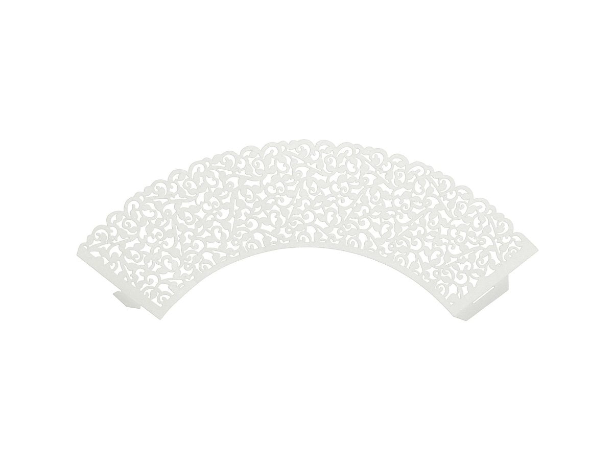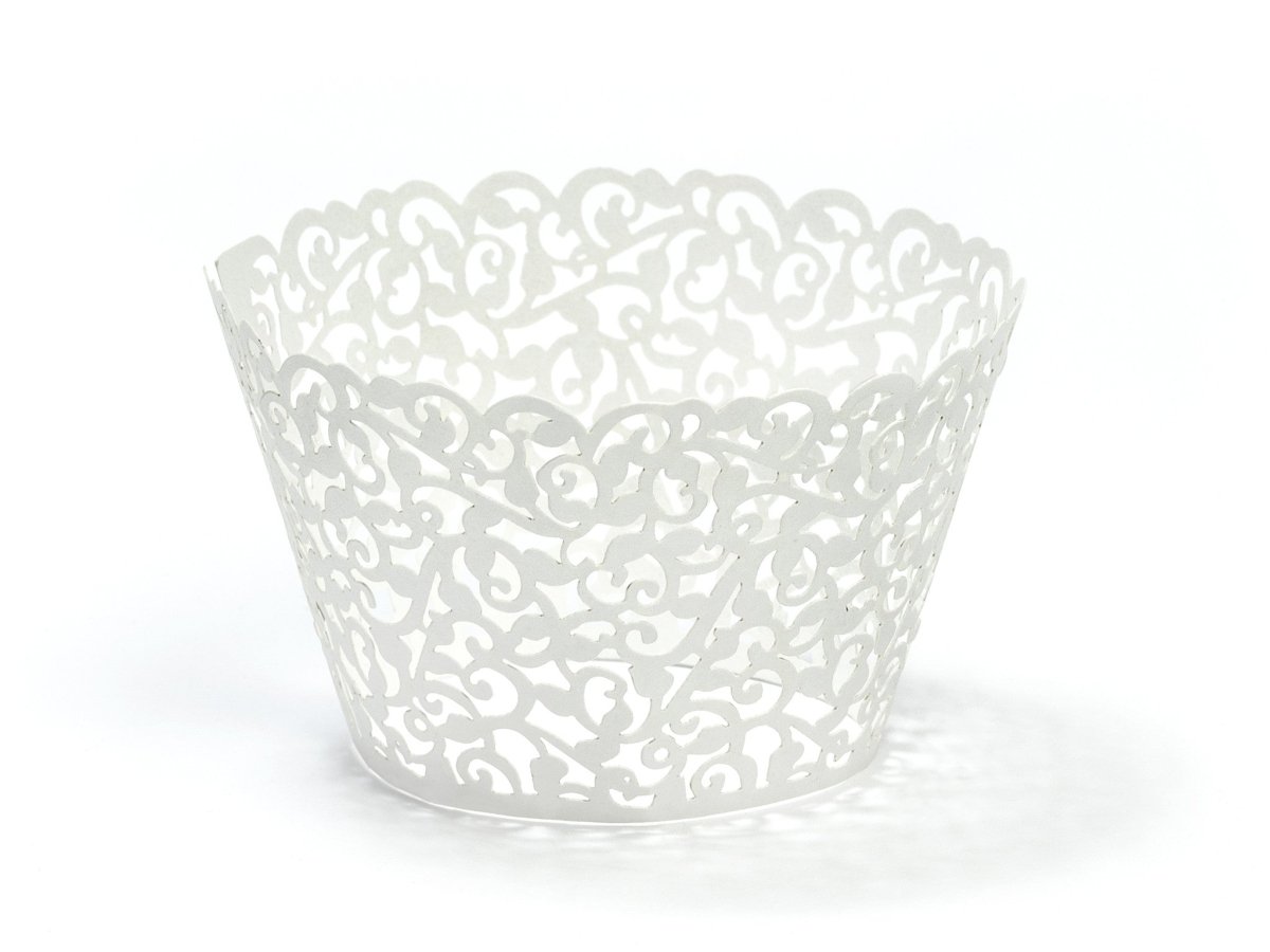Indhold: Cupcakeovertræk, hvid med fjernet ornament, størrelse 5,5 x 8,5 cm. (1 PKT/10 stk)