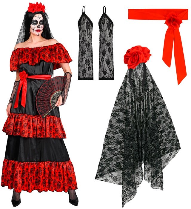 Fejr den farverige og festlige "Día de los Muertos" med dette komplette kvindekostume. Perfekt til halloween, temafester eller kulturelle begivenheder.