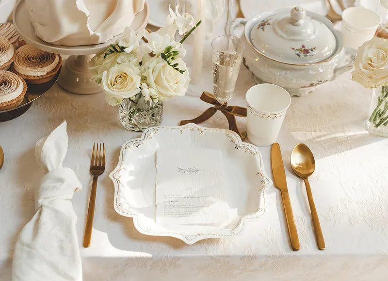 Gør dit festbord ekstra festligt med disse stilfulde papirtallerkener. Det hvide design med gyldne detaljer giver et elegant touch og er ideelt til fødselsdage, konfirmationer, bryllupper eller andre særlige lejligheder.