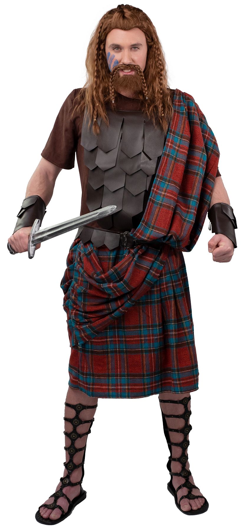 Dette Deluxe Highlander-kostume består af fire dele: en skjorte, en nederdel med skærf og to armbind. Et komplet udklædnings- eller temakostume.