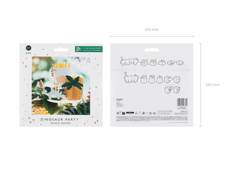 Æsker til snacks Dinosaurer lavet af papir i forskellige farver. Sættet indeholder 4 store og 2 små æsker samt 6 papirelementer. Mål efter samling af små æsker ca. 10 x 10 x 5,5 cm, store æsker ca. 9,5 x 9,5 x 12 cm. Gør det selv-produkt (1 pkt/6 stk)