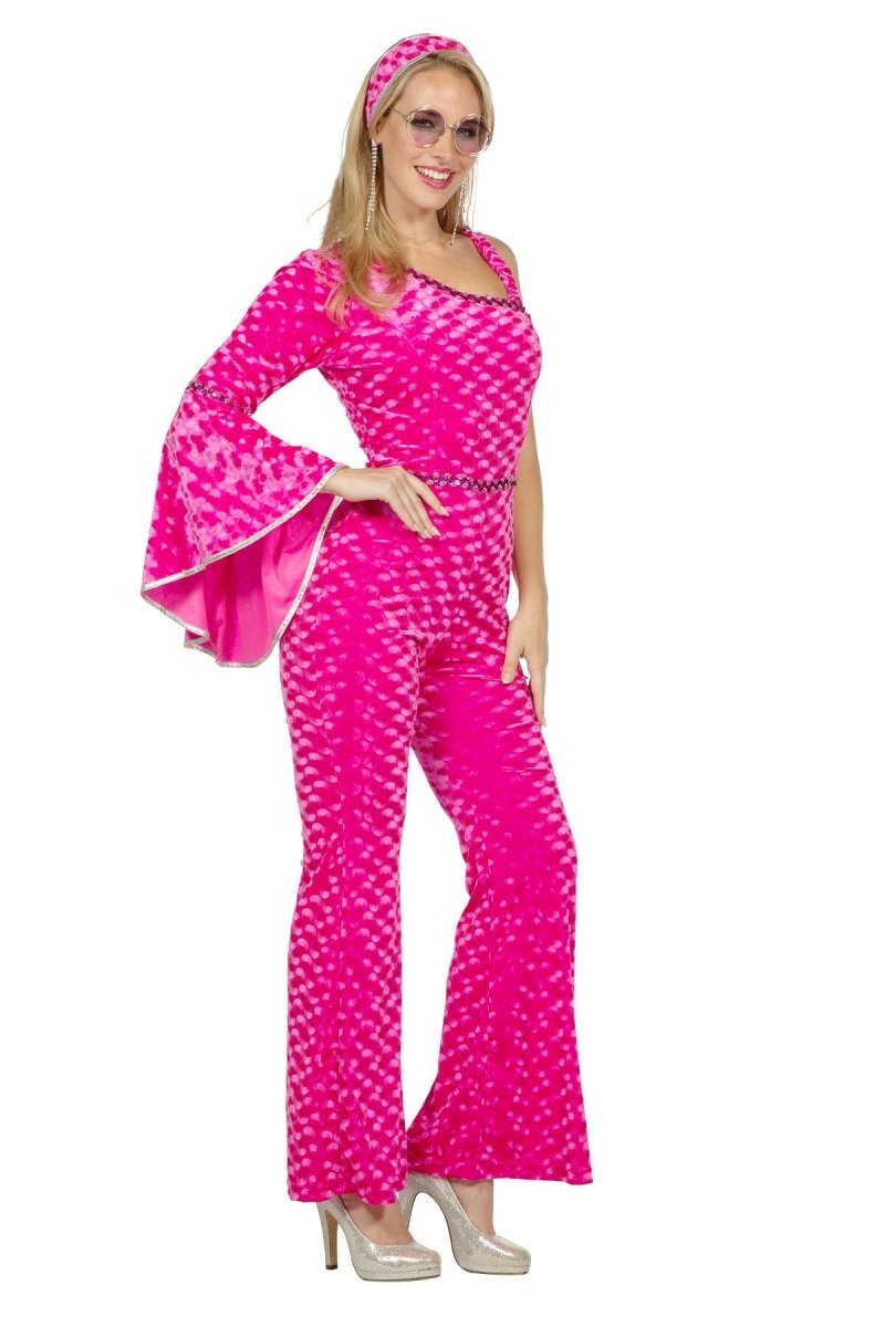 Lav et retro-statement med denne rosa disko-catsuit i fløjl. Perfekt til temafester, karneval eller en dansefest i 70'er-stil.