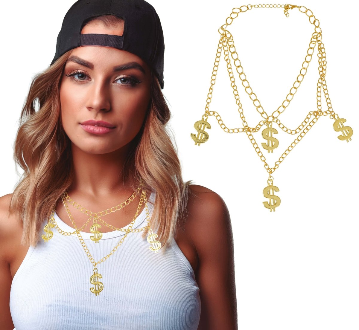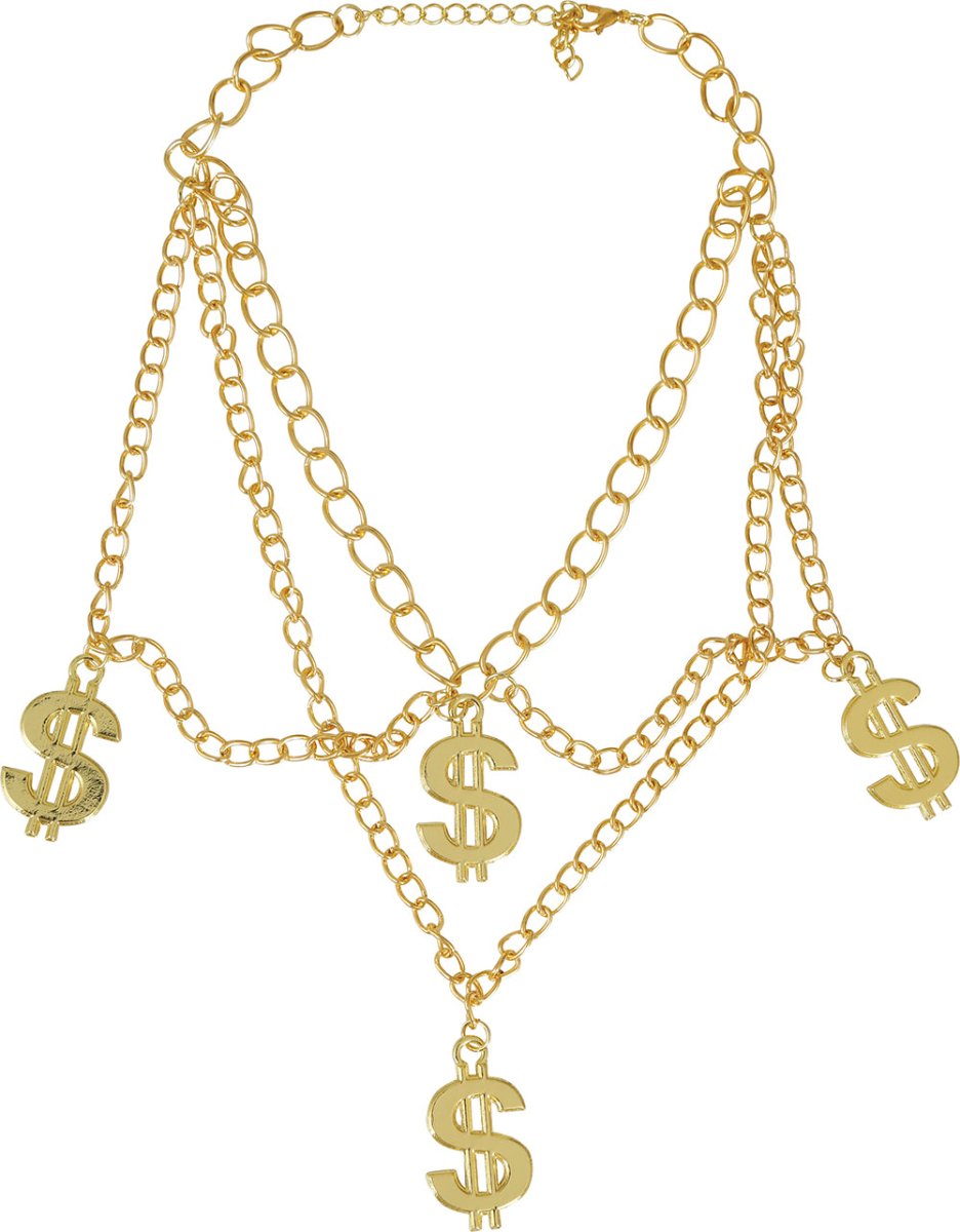 Lav et statement med denne iøjnefaldende guld dollar halskæde. De fire individuelle dollartegn skaber et legende og ekstravagant look, perfekt til fester, forestillinger eller temaaftener.