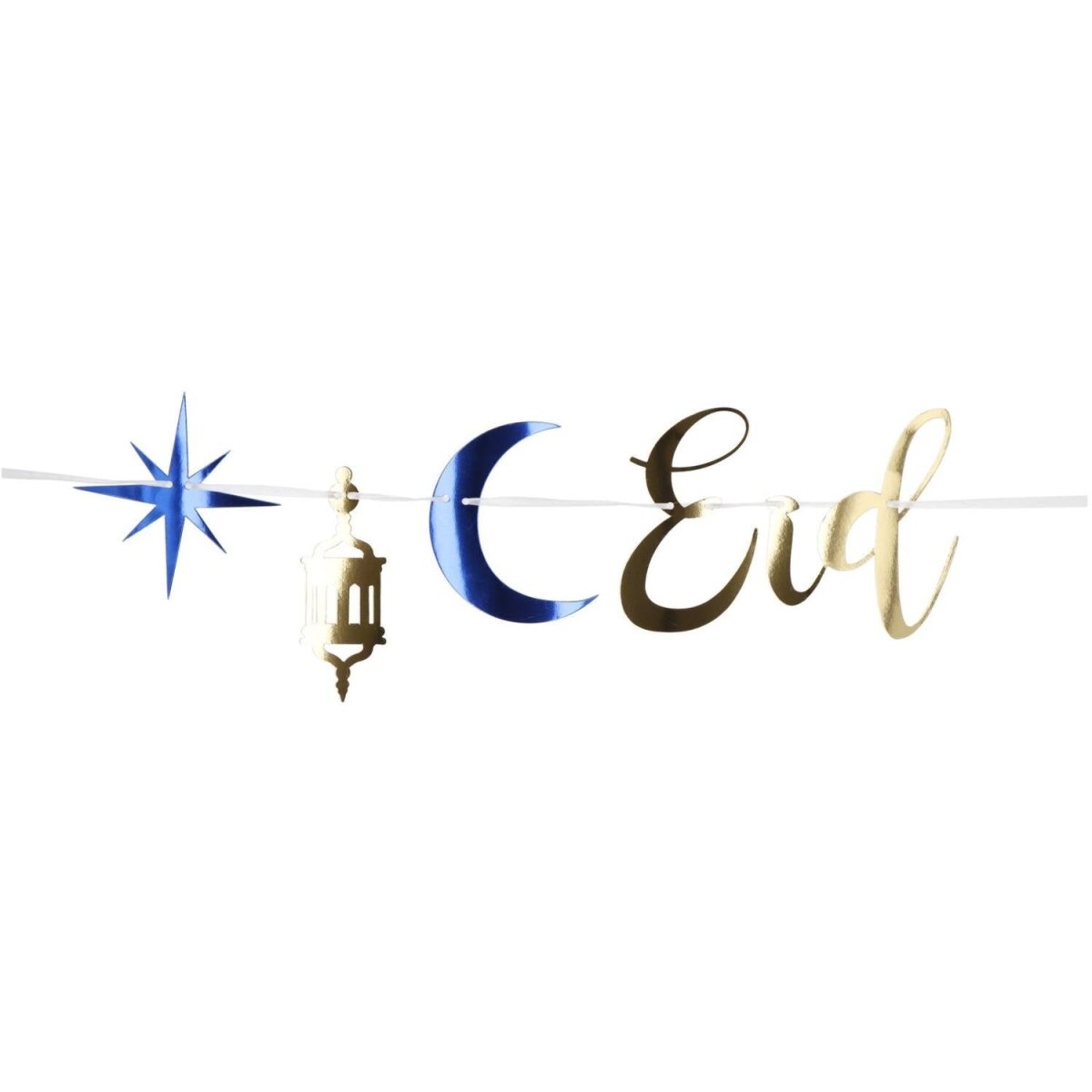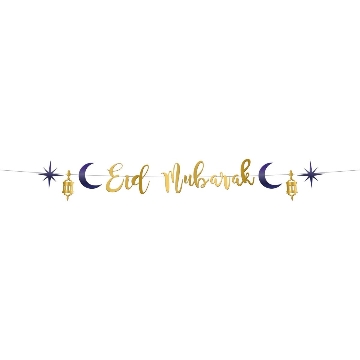 Ønsker hinanden en velsignet fest. Bogstavguirlande 'Eid Mubarak', 1,5 meter. Indhold: 1 bogstavguirlande. Kan f.eks. bruges ved følgende festlige lejligheder: Eid Mubarak. En bogstavguirlande med ønsket 'Eid Mubarak' omgivet af en måne, en olielampe og en stjerne. Bogstaverne og figurerne er lavet af papir og lamineret på den ene side med folie. Kransen er lavet af plastik. Denne vare er lavet af papir og plast.