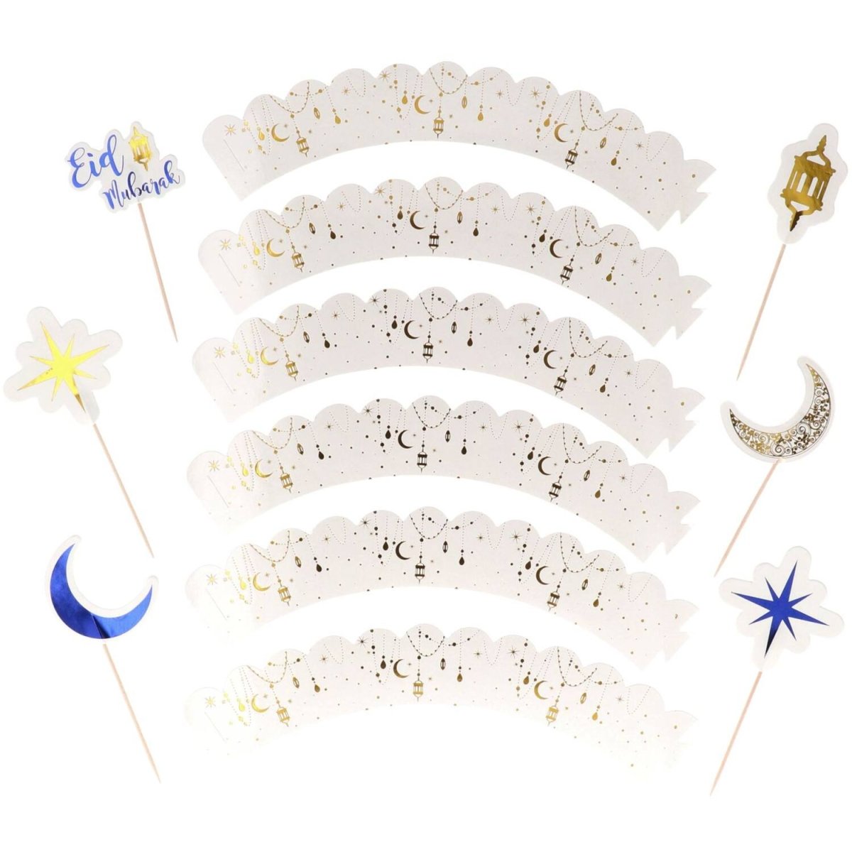 Sådan smager det hele endnu bedre. Cupcake-dekorationssæt, Eid Mubarak, 12 dele. Indhold: 12 kagedekorationer. Kan f.eks. bruges til følgende festlige lejligheder: Eid Mubarak, Temafest. Dette Cupcake Decoration Set består af 6 cupcake wrappers og 6 festlige tandstikkere: en blå måne, en gylden måne, en blå stjerne, en gylden stjerne, en gylden olielampe og en med teksten "Eid Mubarak". Indpakningen og figurerne på tandstikkerne er lavet af ensidigt trykt (hot stamping) papir, selve tandstikkerne er lavet af træ og er 8,5 cm lange. Denne vare er lavet af papir og træ.