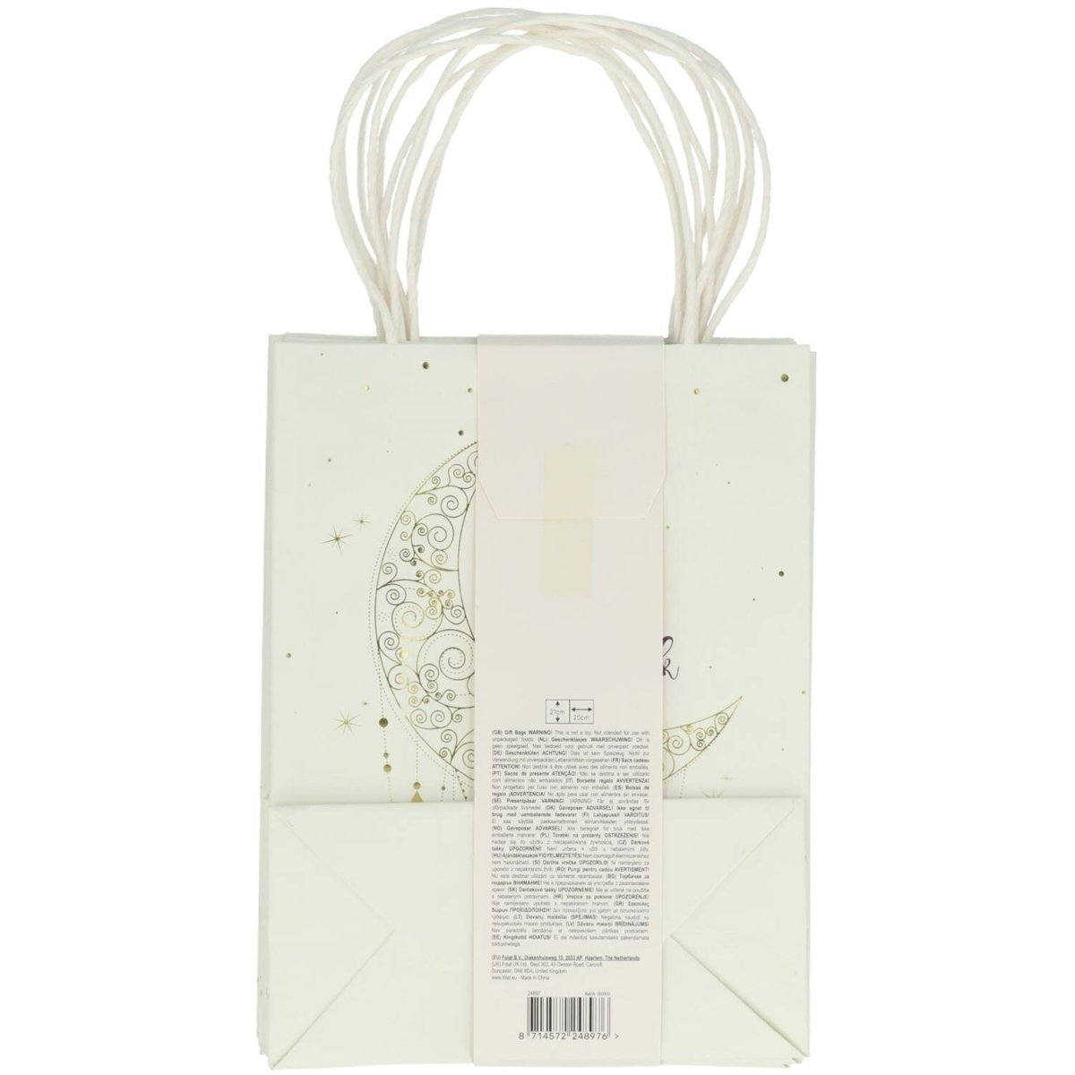 Del i glæde og lykke. Gaveposer 'Eid Mubarak', 20 x 10 x 27 cm, 6 stk. Indhold: 6 gaveposer. Kan f.eks. bruges til følgende fest: Eid Mubarak. Med denne gavepose er det dejligt at modtage og at give. Posen er trykt på begge sider (hot stamping) med ordene 'Eid Mubarak' i glitrende gyldne bogstaver. Håndtagene er lavet af jute omviklet med papir. Denne vare er lavet af papir.