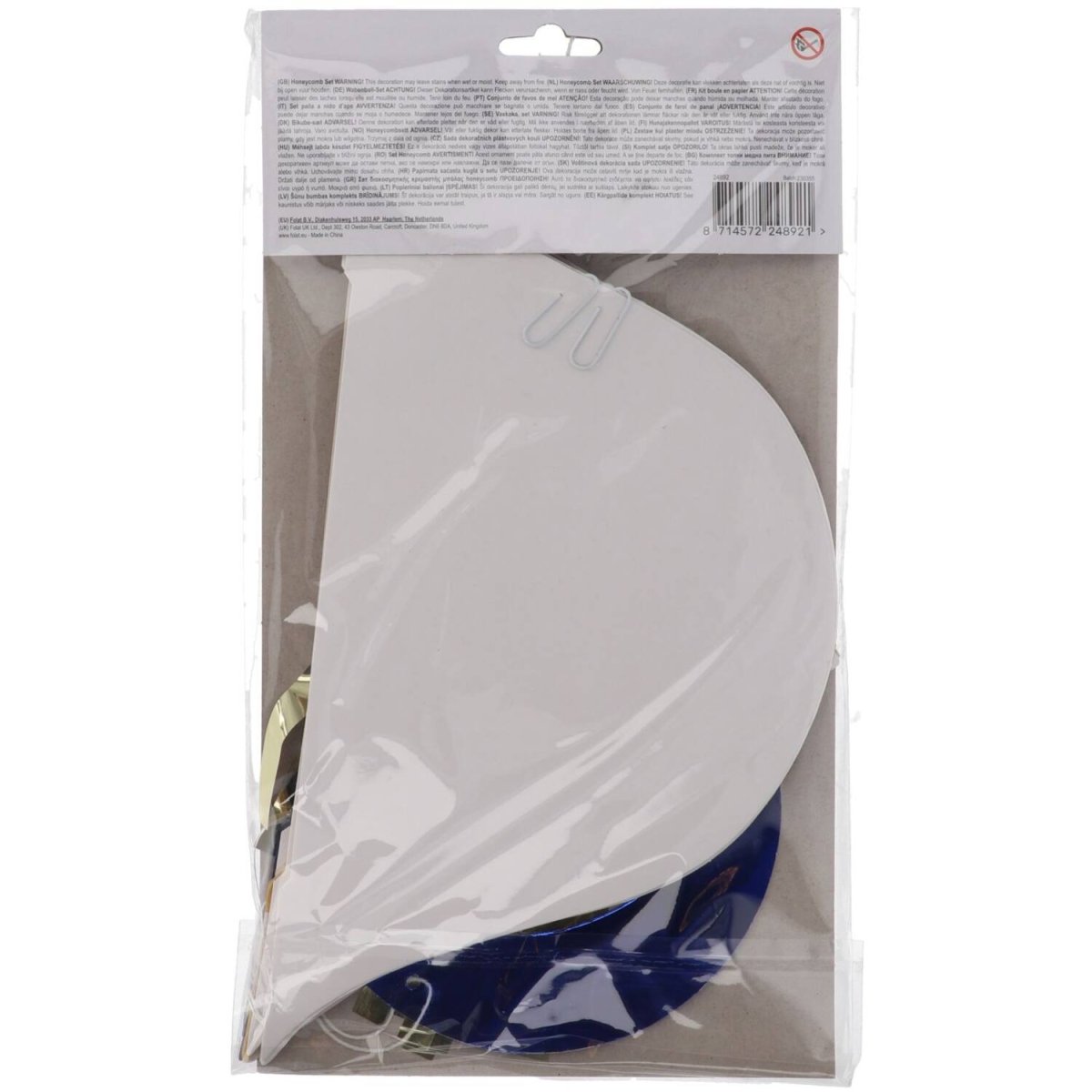 Gør festen endnu mere magisk. Honningkagesæt, Eid Mubarak, 3 stk. Indhold: 3 honningkager. Kan f.eks. bruges til følgende fester/anledninger: Eid Mubarak, Temafest. Et smukt honeycomb-dekorationssæt med vedhæng: en gylden kugle med en mørkeblå måne, en mørkeblå diamant med en gylden frynsekvast og en hvid kugle med en gylden olielampe. Honningkagerne er lavet af papir og gennemfarvede. Vedhængene er lavet af dobbeltsidet trykt metalpapir. Denne fortryllende dekoration er velegnet til alle slags stilfulde fester. Denne vare er lavet af papir og plast.