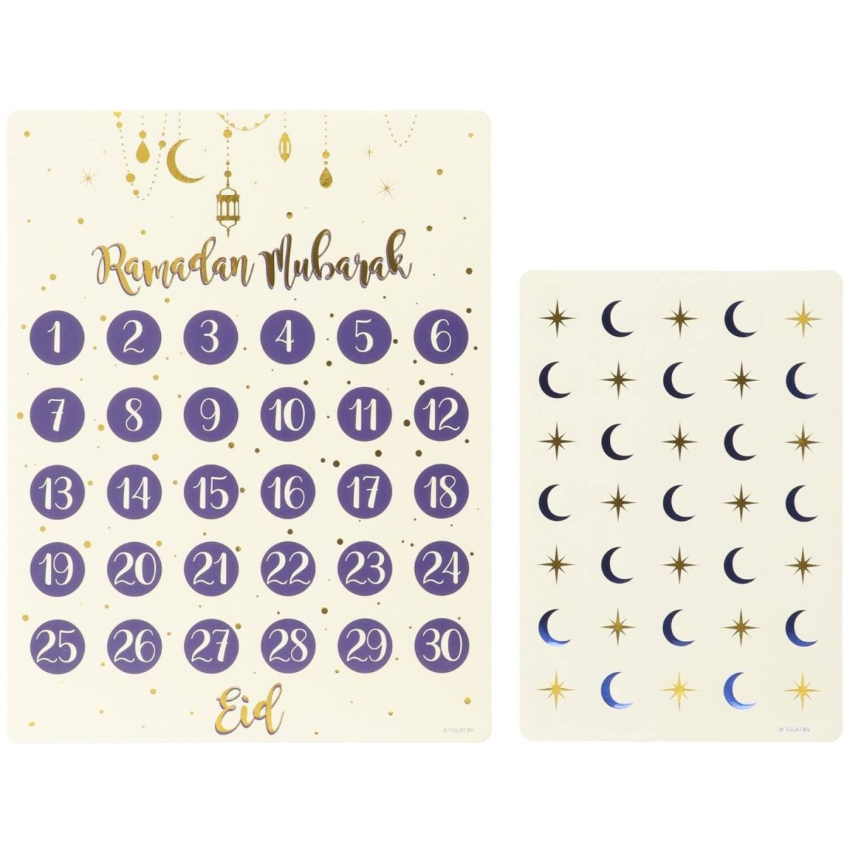 En god ramadan. Nedtællingskalender 'Ramadan Mubarak', Eid Mubarak. Indhold: 1 nedtællingskalender og 1 klistermærkeark. Kan f.eks. bruges til følgende fester: Eid Mubarak. Ved at sætte et klistermærke på denne nedtællingskalender hver dag tæller du ned til Eid al-Fitr, festen i slutningen af fasten (Ramadan). Kalenderen måler 18 x 23,5 cm, og klistermærkearket er 12 x 17,5 cm. De er begge ensidigt trykt (hot stamping) og kommer sammen i 1 pakke. Klistermærkerne har et guld- og mørkeblåt folietryk. Denne artikel er lavet af papir.