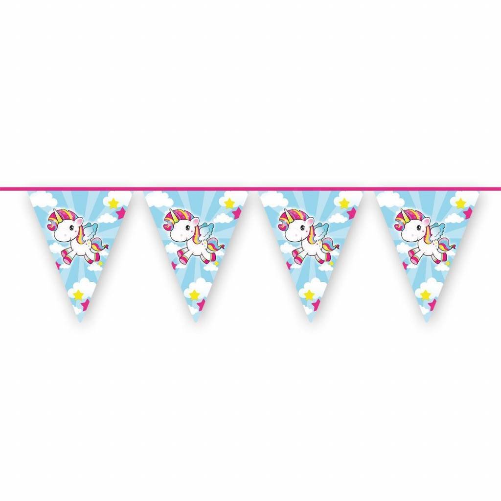 Unicorn Flagline - 10 meter. Indhold: 1 flagline. Farve: Flerfarvet. Produkttema: Enhjørning. Kan f.eks. bruges til følgende fester/anledninger: børnefødselsdag. Denne guirlande er 10 meter lang med 15 flag på 27 cm. Varen er fremstillet af plast.