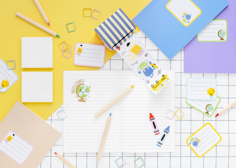 Skoleklistermærker, blanding af mønstre og farver, sættet indeholder 3 klistermærkeark og 16 noteklistermærker, mål ca. 5,8x7,8 cm