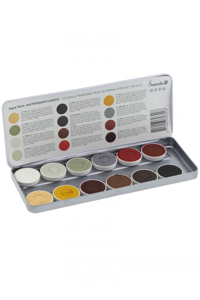 Matte og skinnende farver: De matte farver er ideelle til make-up baser og påføring af linjer. De skinnende glimmerfarver er lidt blødere og perfekte til at lave kreative baser. Der skal bruges lidt vand for at aktivere glimmerfarverne.