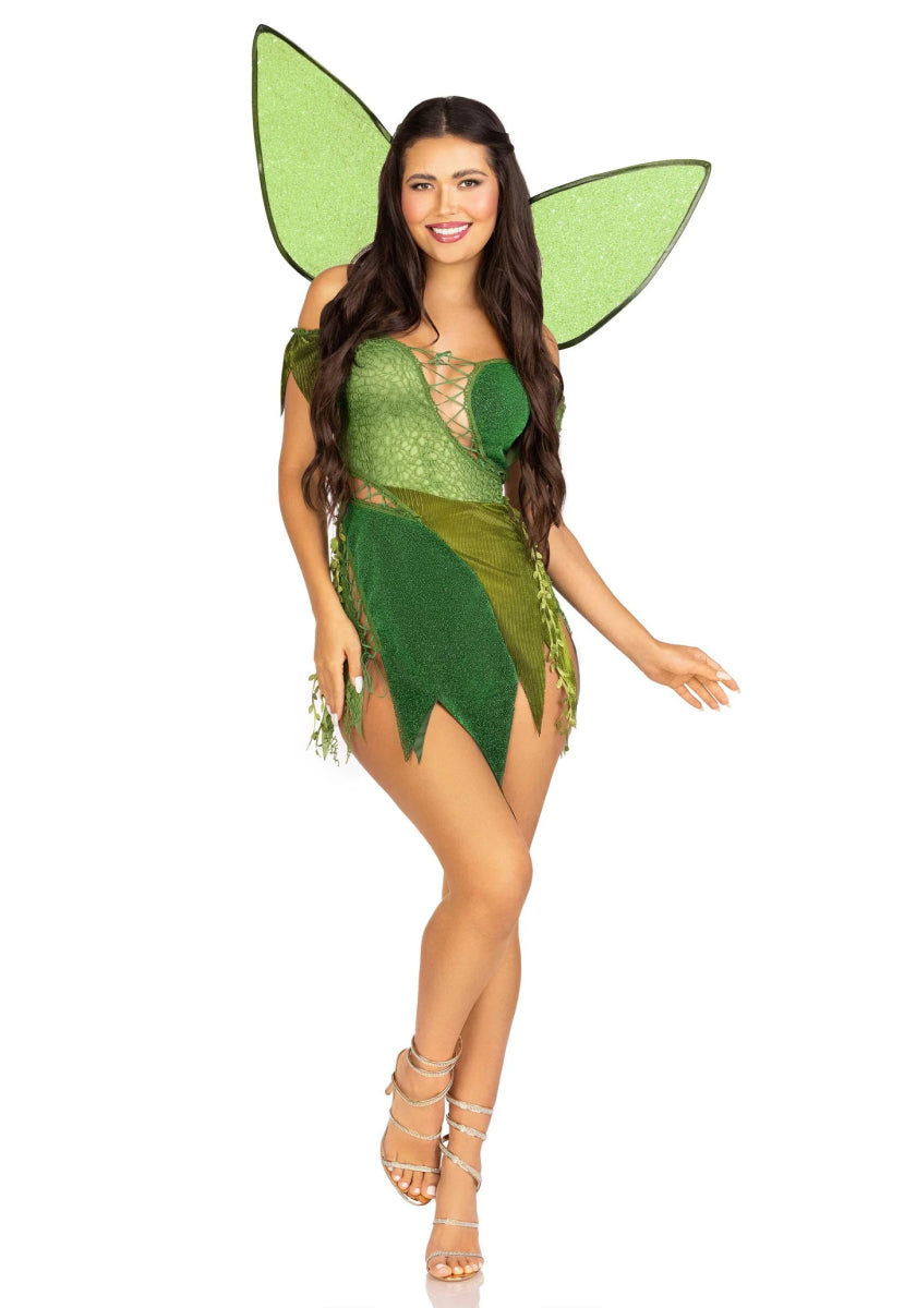 Træd ind i rampelyset, og lad din indre troldkvinde skinne i Skovfe-kostumet fra Leg Avenue! Dette fortryllende 3-delte ensemble består af en smuk patchwork-kjole med justerbare snørebånd og et skørt dekoreret med bladdetaljer. De aftagelige gennemsigtige stropper og glitrende fe-vinger giver et ekstra strejf af magi og alsidighed. Perfekt til halloween, karneval eller andre temafester, hvor du vil have dit fortryllede skovfe-look til at skinne! 🌿🦋