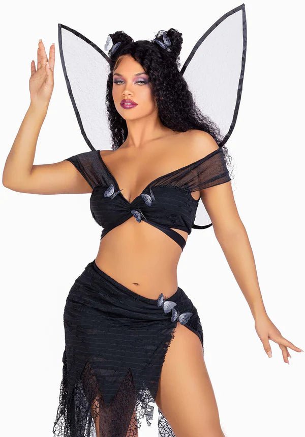 Fortryl alle omkring dig i det 4-delte Dark Fairy Set fra Leg Avenue! Sættet indeholder en crop top med sommerfugle, en asymmetrisk nederdel med netovertræk, sommerfugleclips og glitrende vinger. Dette outfit er perfekt til halloween, cosplay eller temafest og vil få dig til at stråle både magisk og modigt! ✨💫