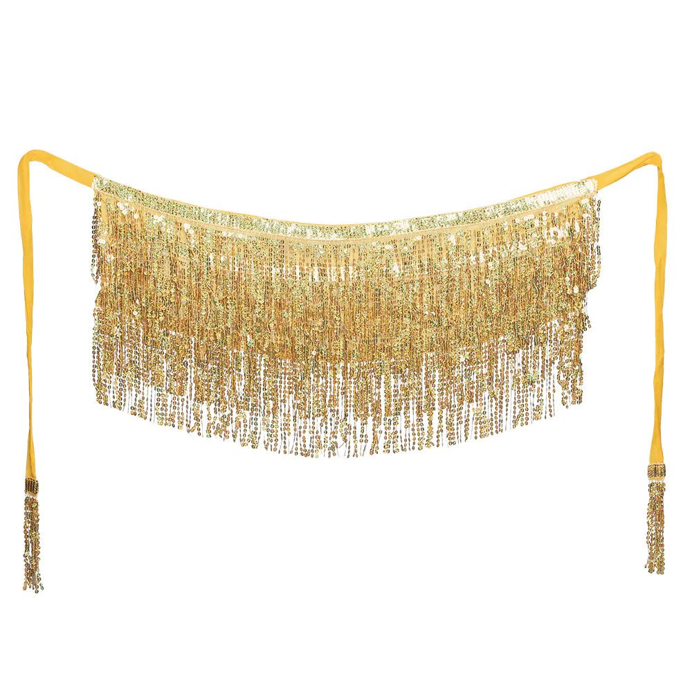 Dette guldbælte med frynser udstråler ren glamour. På ingen tid kan du skabe et slående festival-look med en ubestridelig wow-faktor. Men dette bælte er også fantastisk til en 1001 nats temafest, eller når du skal fejre karneval som en ægte mavedanser.