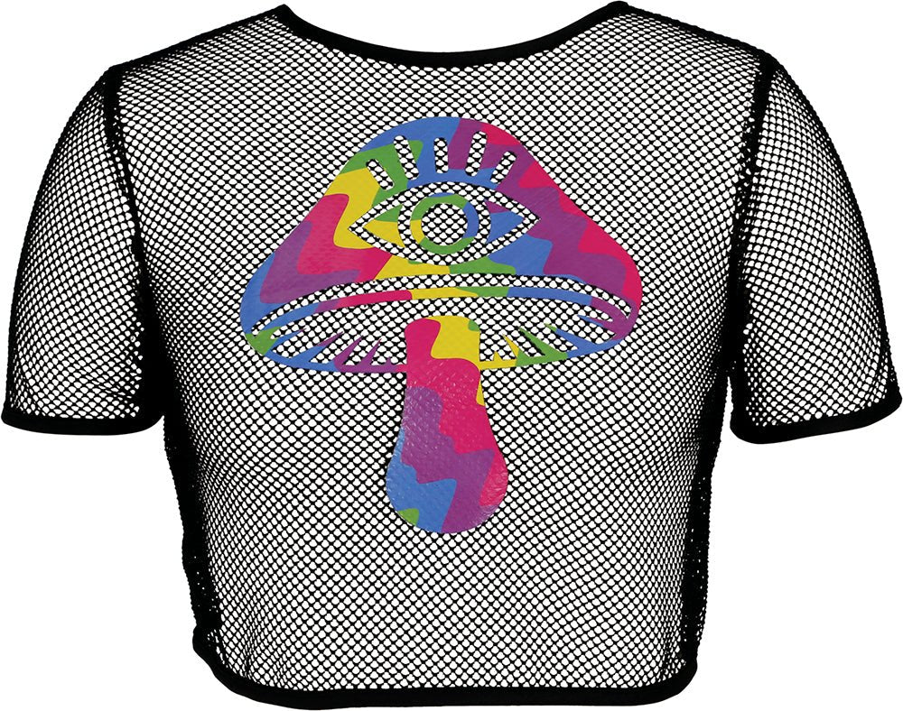 Denne sorte Shrooms mesh t-shirt er et ægte blikfang til fester, festivaler eller temaaftener. Det gennemsigtige mesh-stof skaber et moderne og iøjnefaldende look, mens det lette polyestermateriale er behageligt at have på, selv når det bruges i længere tid. Ideel til at kombinere med forskellige outfits for en moderne stil.