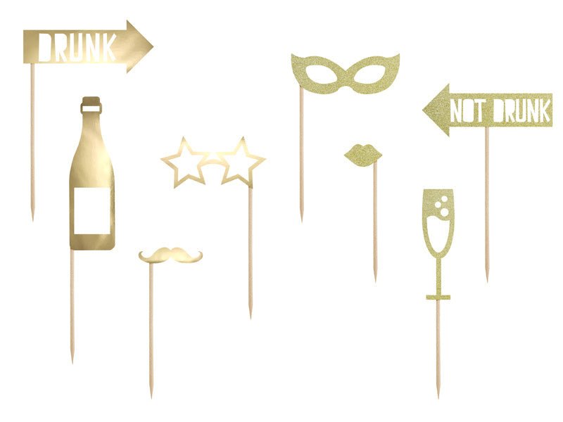 Selfie-fotoramme-sæt, sættet består af: hvid fotoramme med guldpåskrift Best Wedding (størrelse efter montering ca. 50 x 59,5 cm, 1 stk.), rekvisitter på pind i guldfarve (højde efter montering ca. 21 - 42 cm, 8 stk.), transparente balloner med guldhjerteprint (størrelse ca. 30 cm, 3 stk.) og ca. 3 m guldfarvet snor.