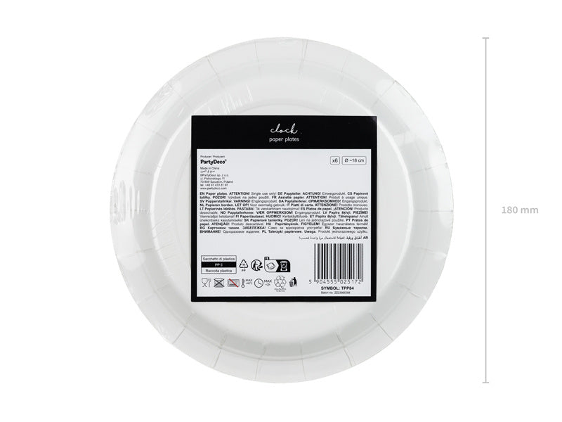 Papirtallerkener Clock i sort farve med guldtryk, størrelse ca. 18 cm.(1 pk/6 stk.) Materiale: Papir ubestrøget med folie og umalet - 100%