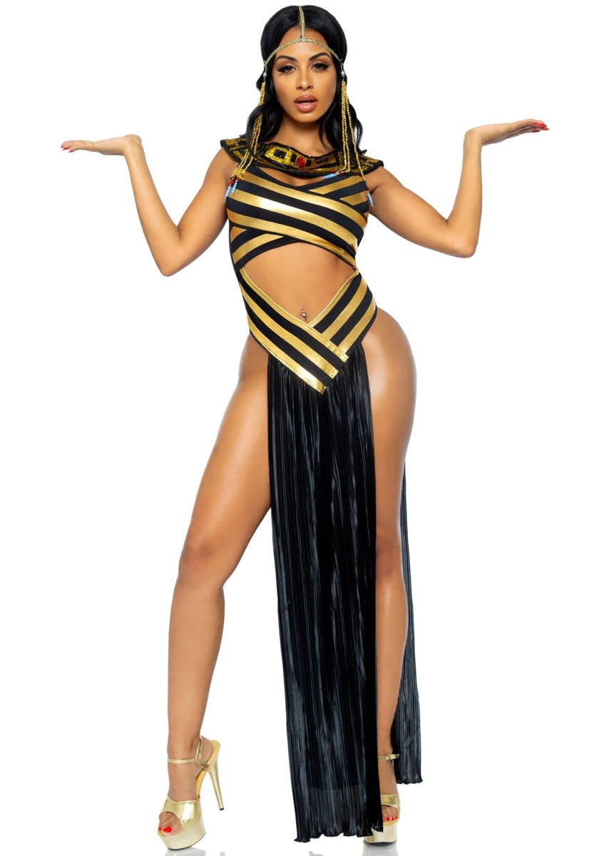 Skinn som en mytisk åbenbaring i Goddess-kostumet fra Leg Avenue! Dette majestætiske 3-delte ensemble omfatter en guldskinnende catsuit, en udskåret kjole med funklende juveler på kraven og et matchende hovedsmykke. Perfekt til halloween, karneval eller enhver fortryllende temafest, hvor du vil stråle som en ægte gudinde! ⚡🏛️