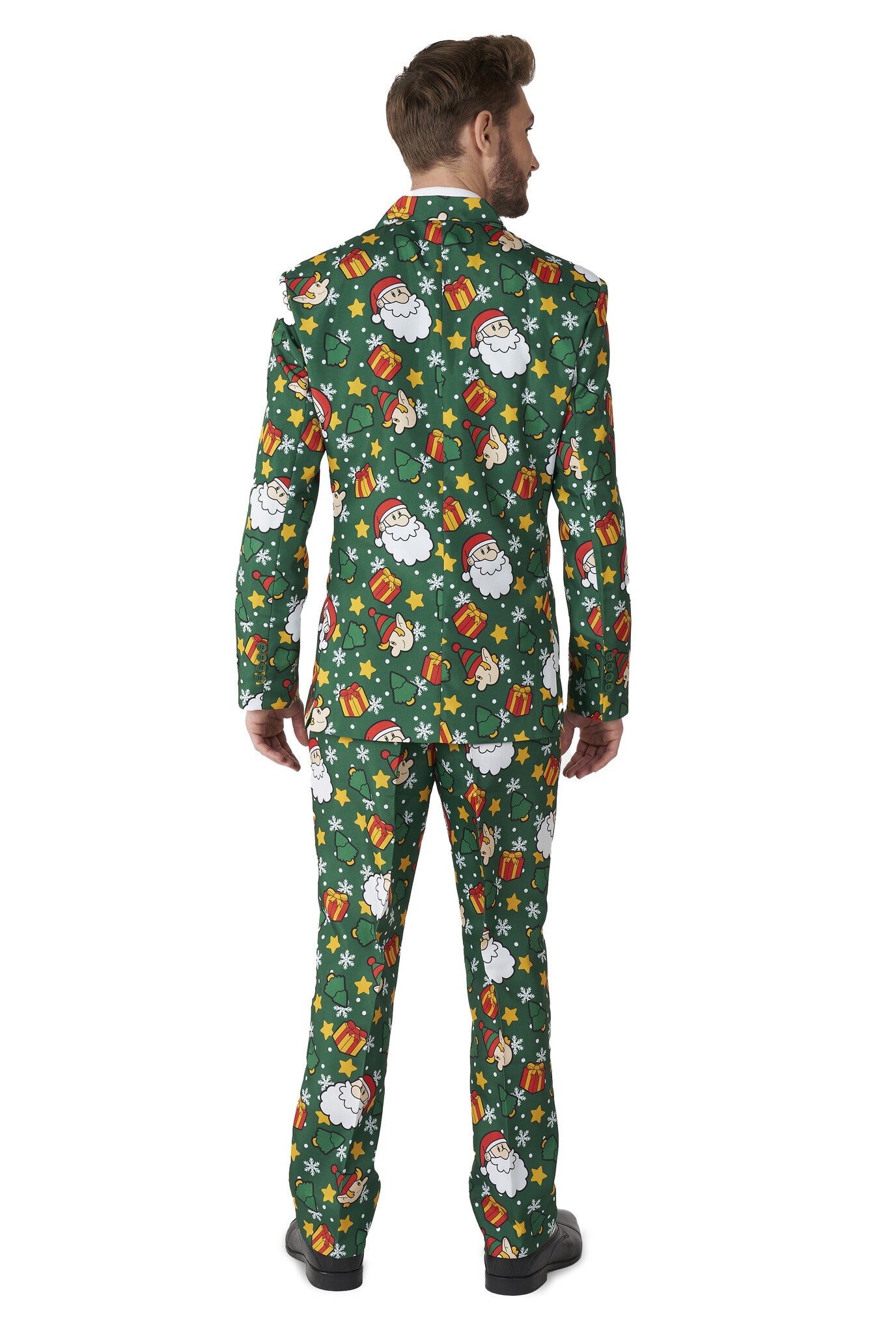 Denne grønne juledragt vil helt sikkert glæde hele familien og alle dine kolleger. Printet viser alt, hvad der har med jul at gøre, såsom gaver, træer, nisser og selvfølgelig julemanden. Perfekt til feriesæsonen! Det tætsiddende sæt består af jakke, bukser og slips. Bukserne har en justerbar linning for en perfekt pasform.