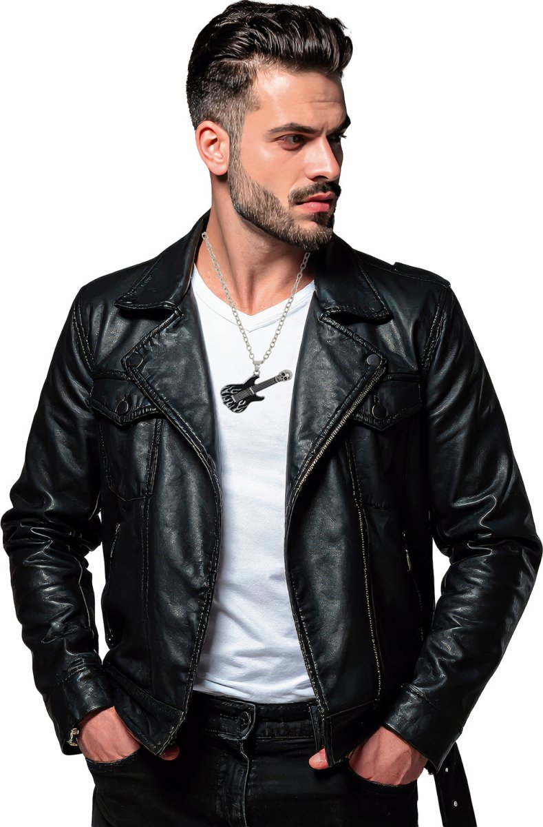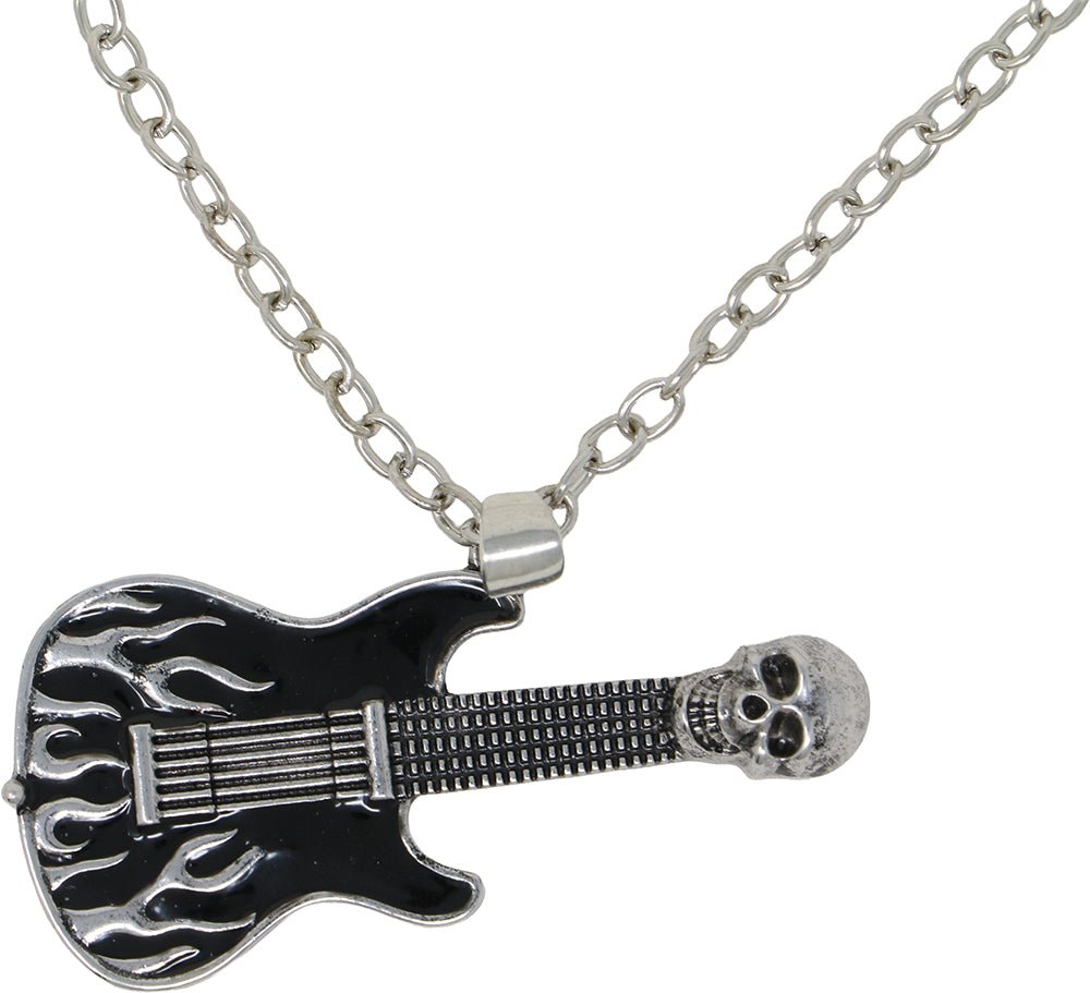 Vis din musikalske side med denne stilfulde halskæde med vedhæng i form af en elektrisk guitar. Den sorte og sølvfarvede finish giver halskæden et cool og moderne look, der er perfekt til musikfans, festivaler eller temafester. Den er lavet af holdbart metal og er behagelig at have på både til hverdag og som iøjnefaldende tilbehør til et kostume.