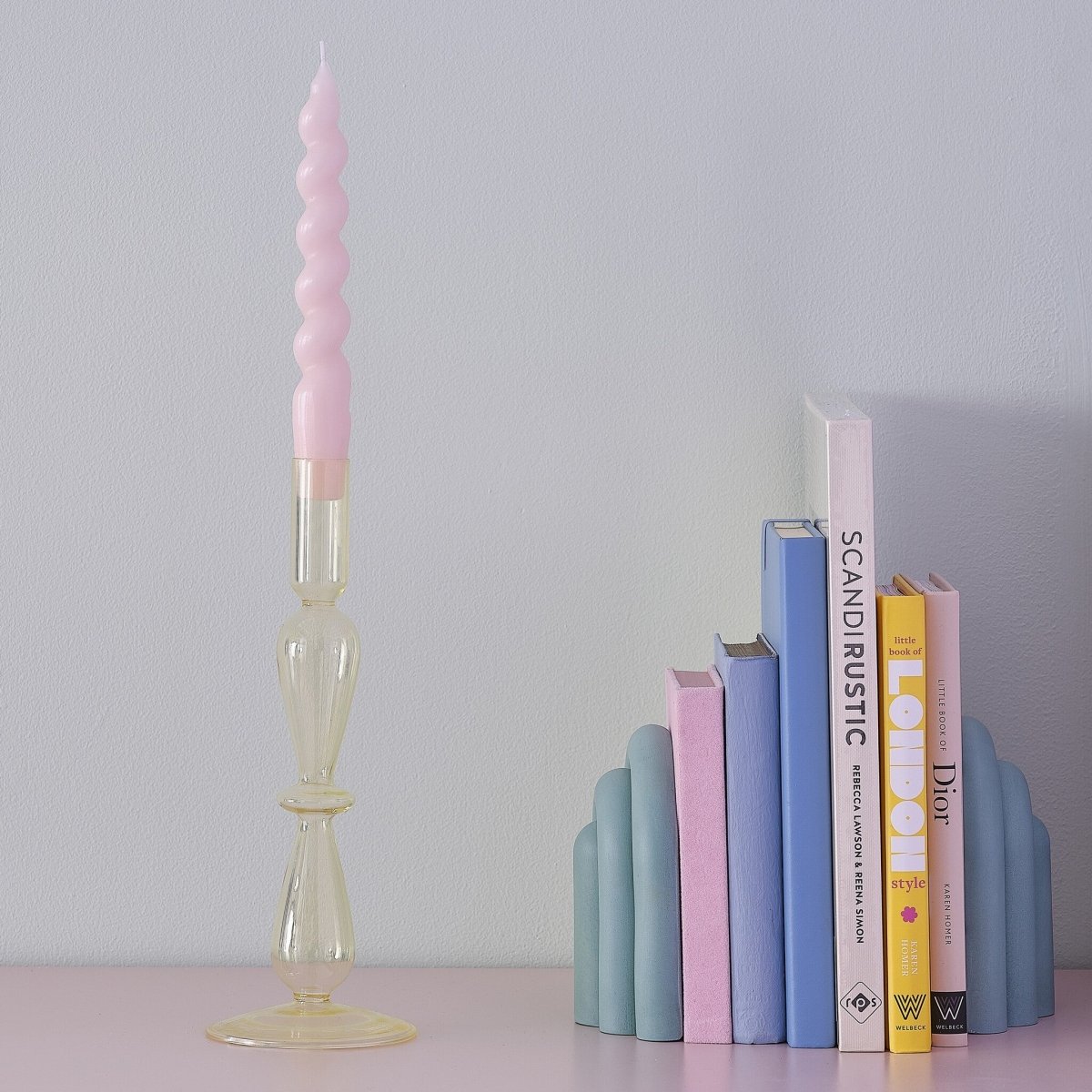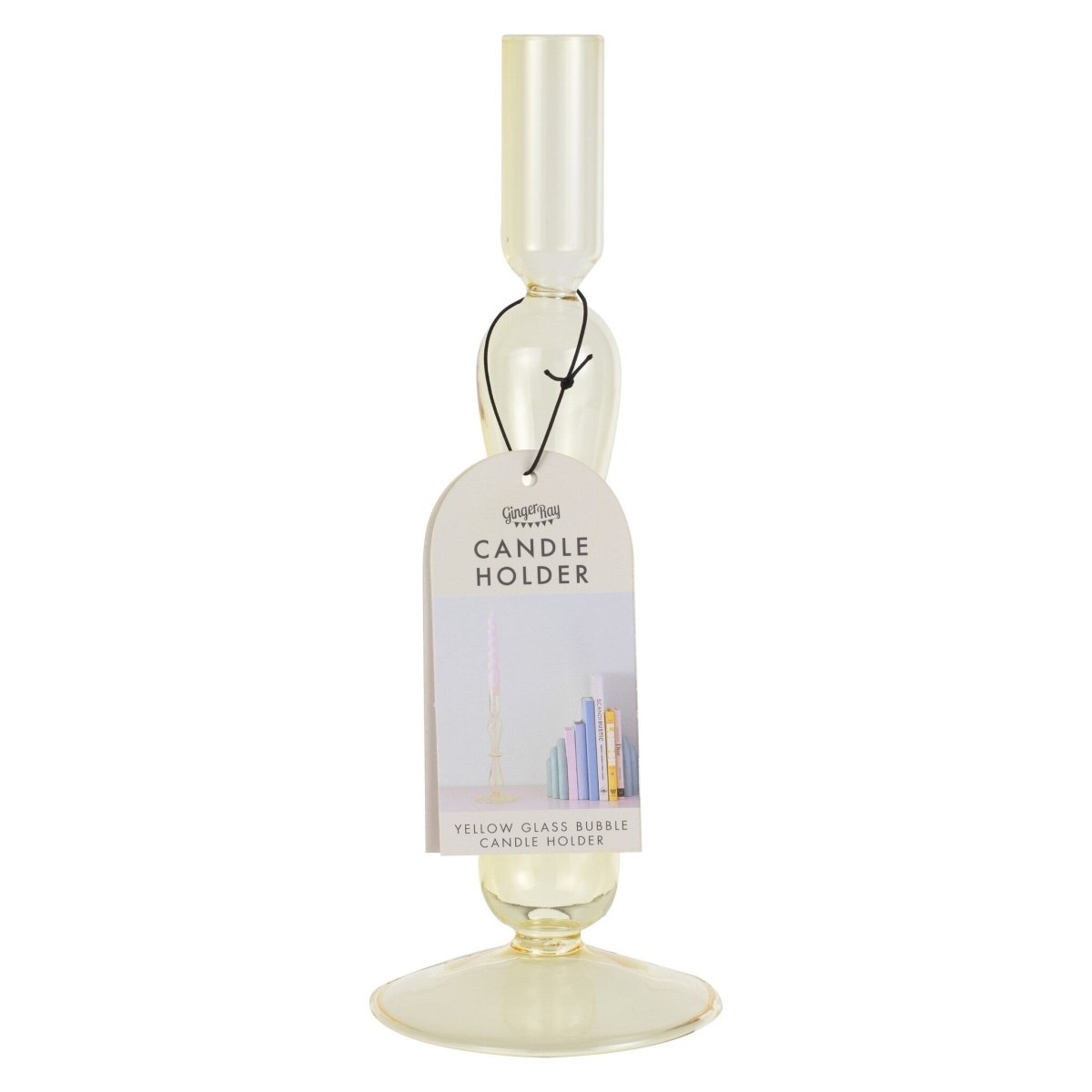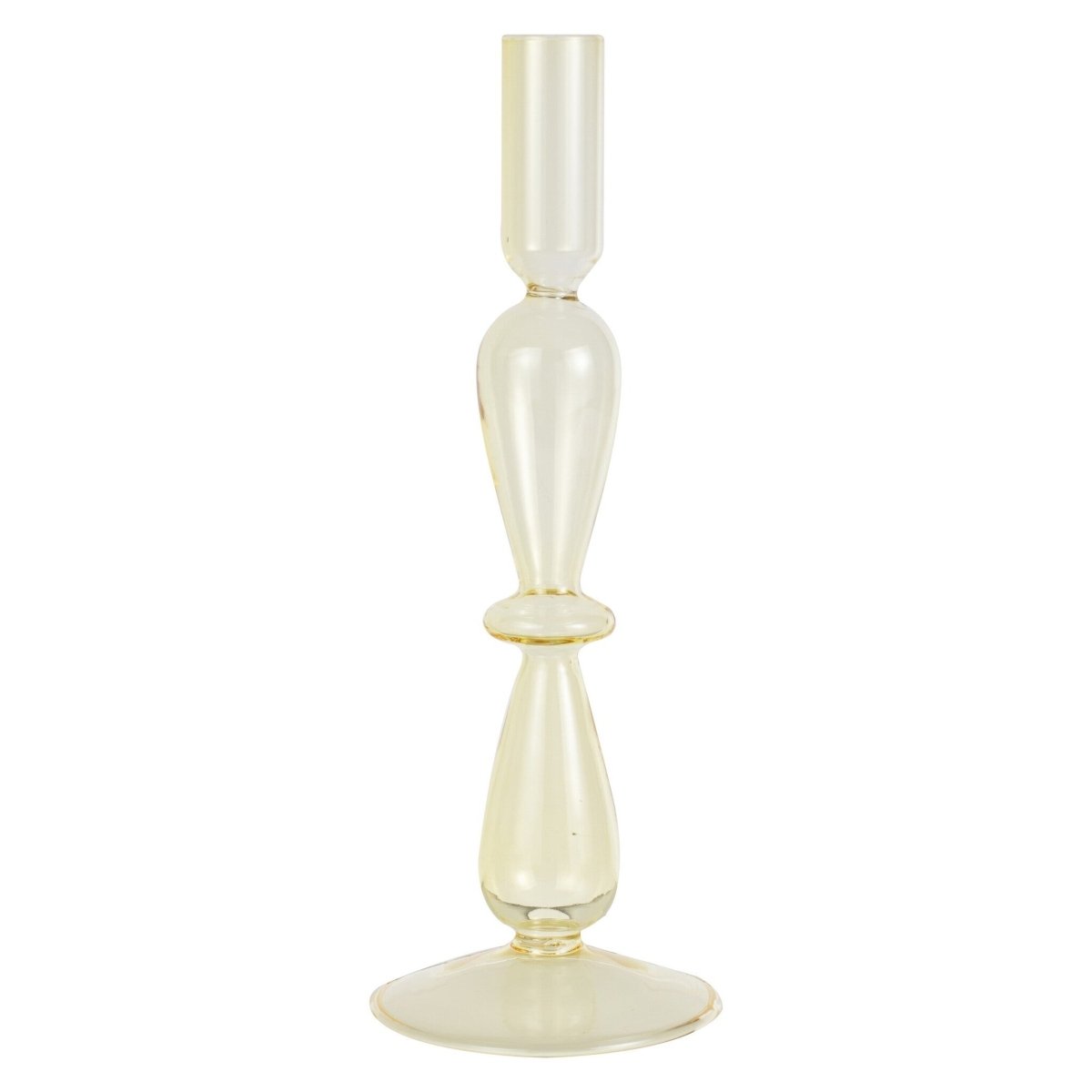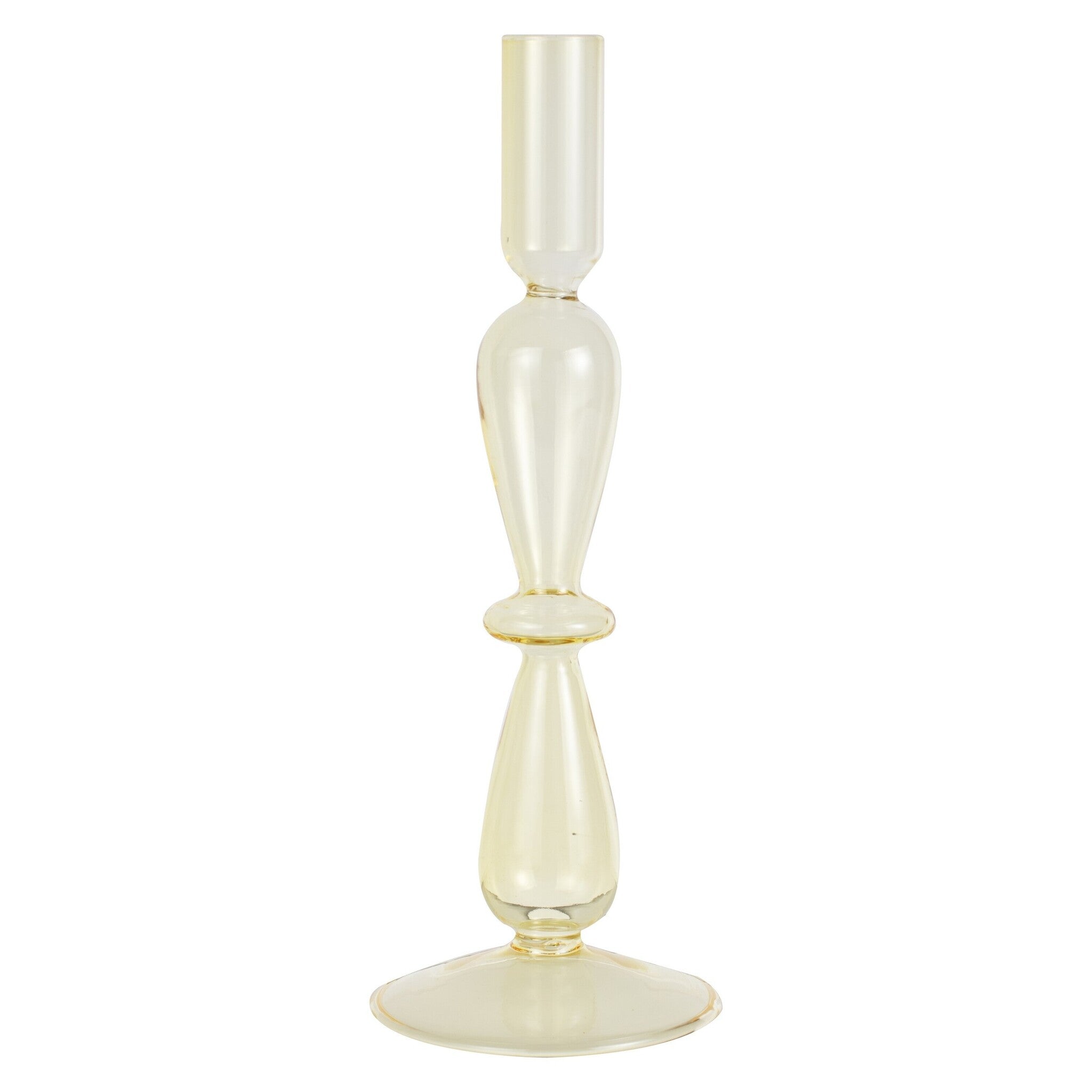 Lys op på dit bord eller i din indretning med denne sjove gule lysestage i glas. Denne pastelfarvede lysestage er det perfekte trendy møbel til middagsbordet eller kaminhylden.