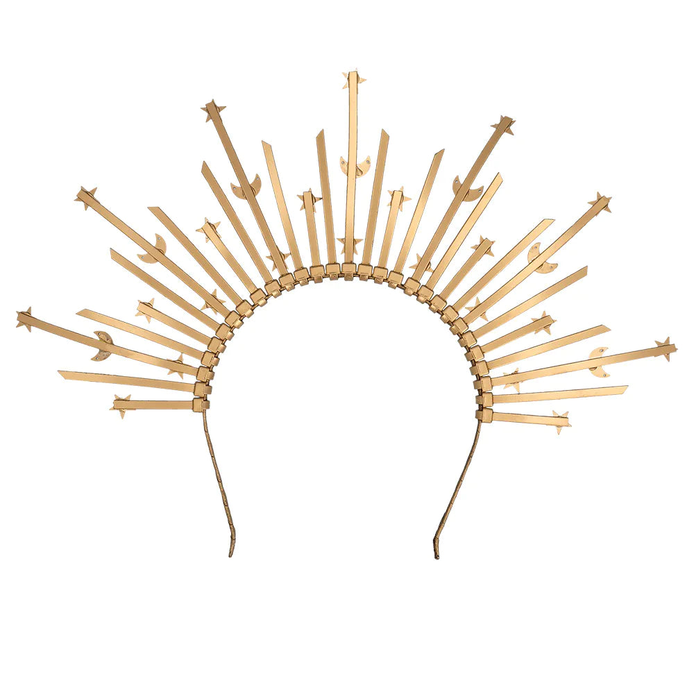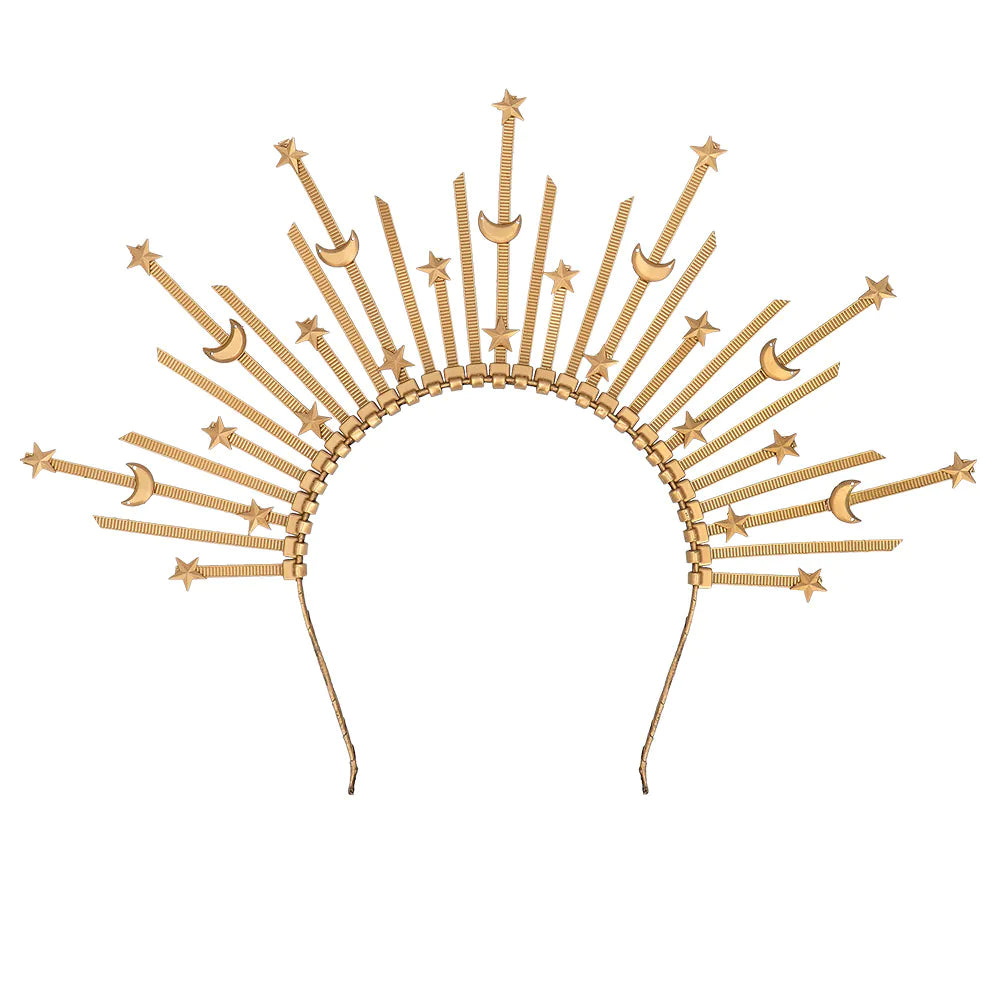 Med en halokrone kan du få ethvert festival-, fest- eller bryllupsoutfit til at skinne. Denne smukke gyldne halokrone er dekoreret med halvmåner og stjerner og giver ethvert outfit et magisk Boho-look. Derudover kan dette unikke tilbehør også sætte prikken over i'et på et originalt karnevals- eller Cosplay-kostume som gudinde.