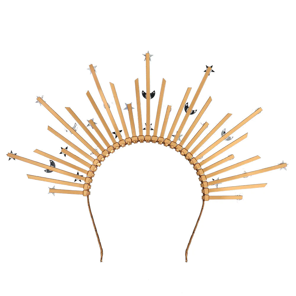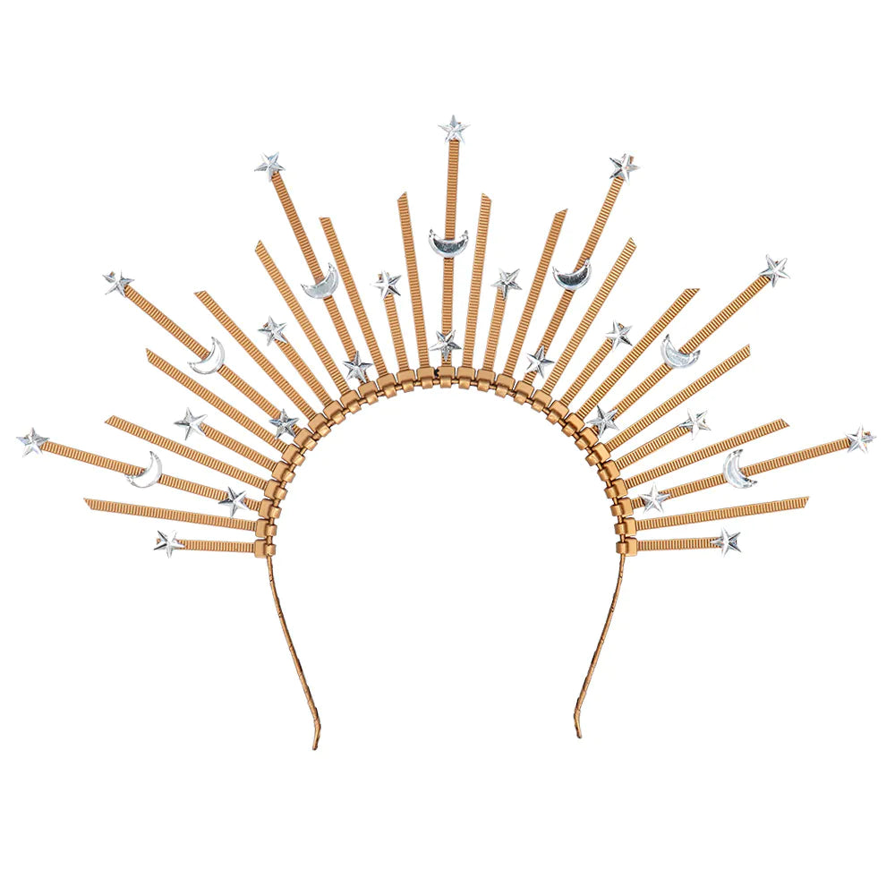 En halokrone er et unikt tilbehør, der kan få ethvert festival-, fest- eller bryllupsoutfit til at skinne. Dette smukke diadem i guld med sølvhalvmåner og stjerner giver ethvert outfit et magisk Boho-look, men kan bestemt også sætte prikken over i'et på et fortryllende karnevals- eller Cosplay-outfit som en gudinde.