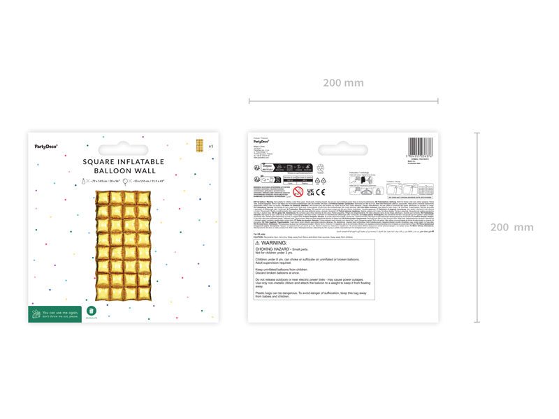 Baggrund af ballonfolie i guldfarve. Størrelse før oppustning ca. 72x143 cm. Størrelse efter oppustning 55x110 cm. Pustes op med luft. Sættet indeholder sugerør.