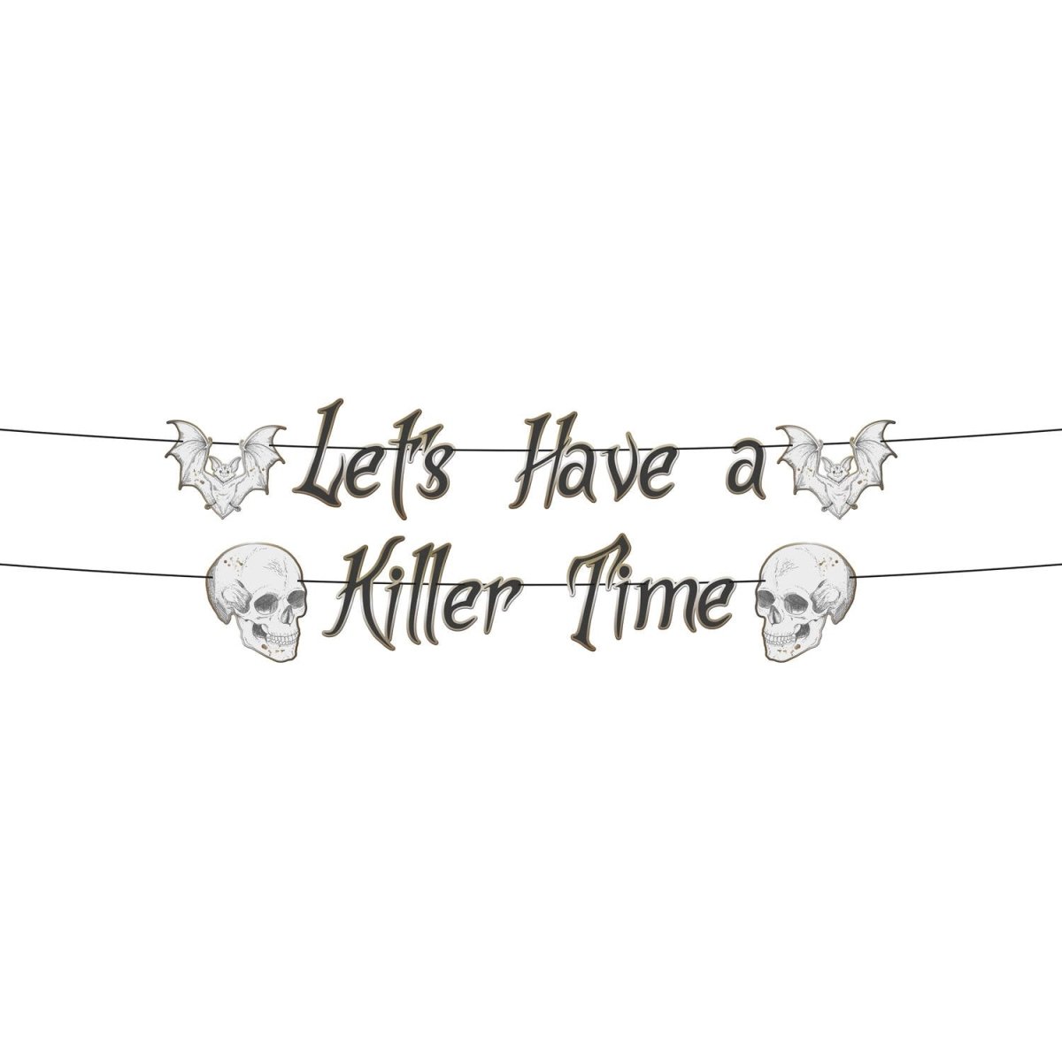 Det bliver en fantastisk fest! Bogstavguirlande sæt - Creepy Curiosities - 1 meter . Indhold: 2 bogstavguirlander. Kan f.eks. bruges til følgende fester/anledninger: Halloween, temafest. To bogstavguirlander, der tilsammen danner sætningen "Let's Have a Killer Time". På den ene guirlande står der: "Let's Have a" med en flagermus på begge sider, og på den anden guirlande står der: "Killer Time" med et kranie på begge sider. Bogstaverne kan flyttes hen over det hvide polyesterbånd. Vær opmærksom på, at nogle bogstaver sidder fast på hinanden og derfor ikke kan flyttes separat. De enkelte bogstavguirlander er hver især ca. 1 meter lange og har en højde på 14 cm. Med rigtig skinnende gulddetaljer. Denne vare er lavet af papir.