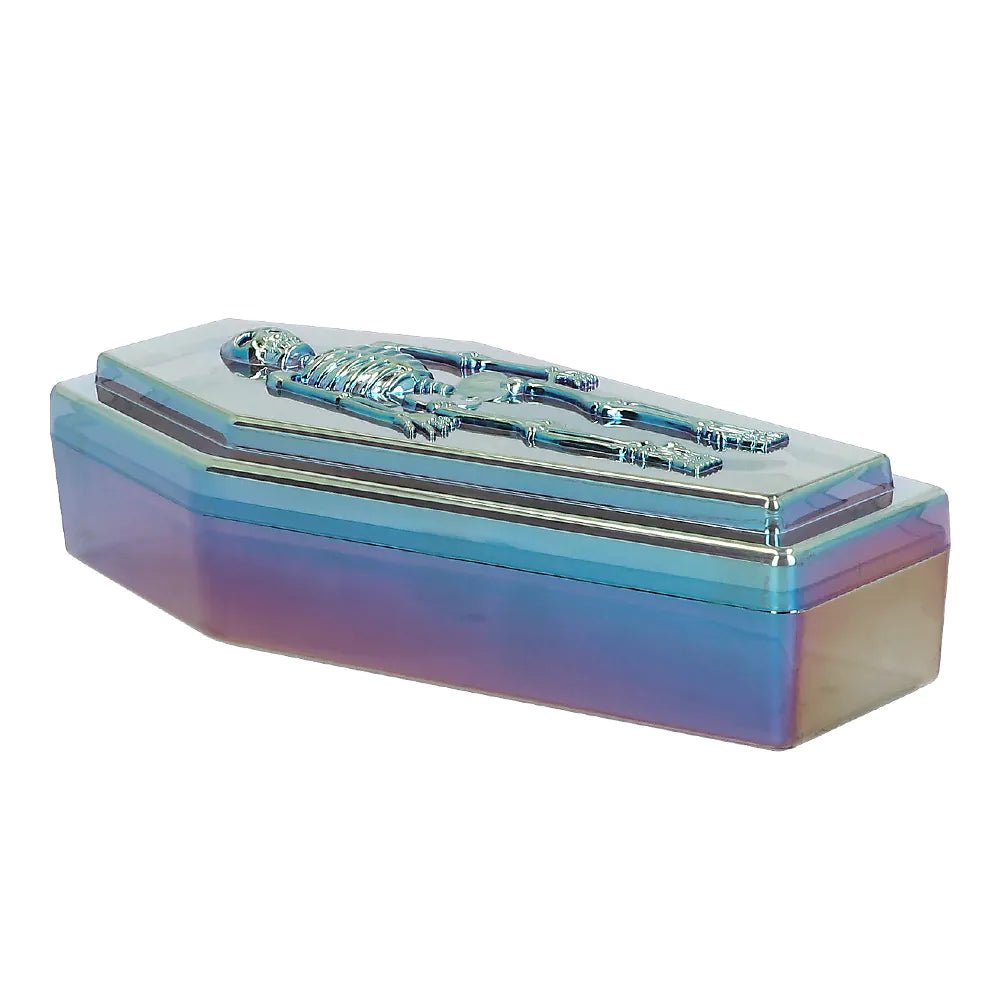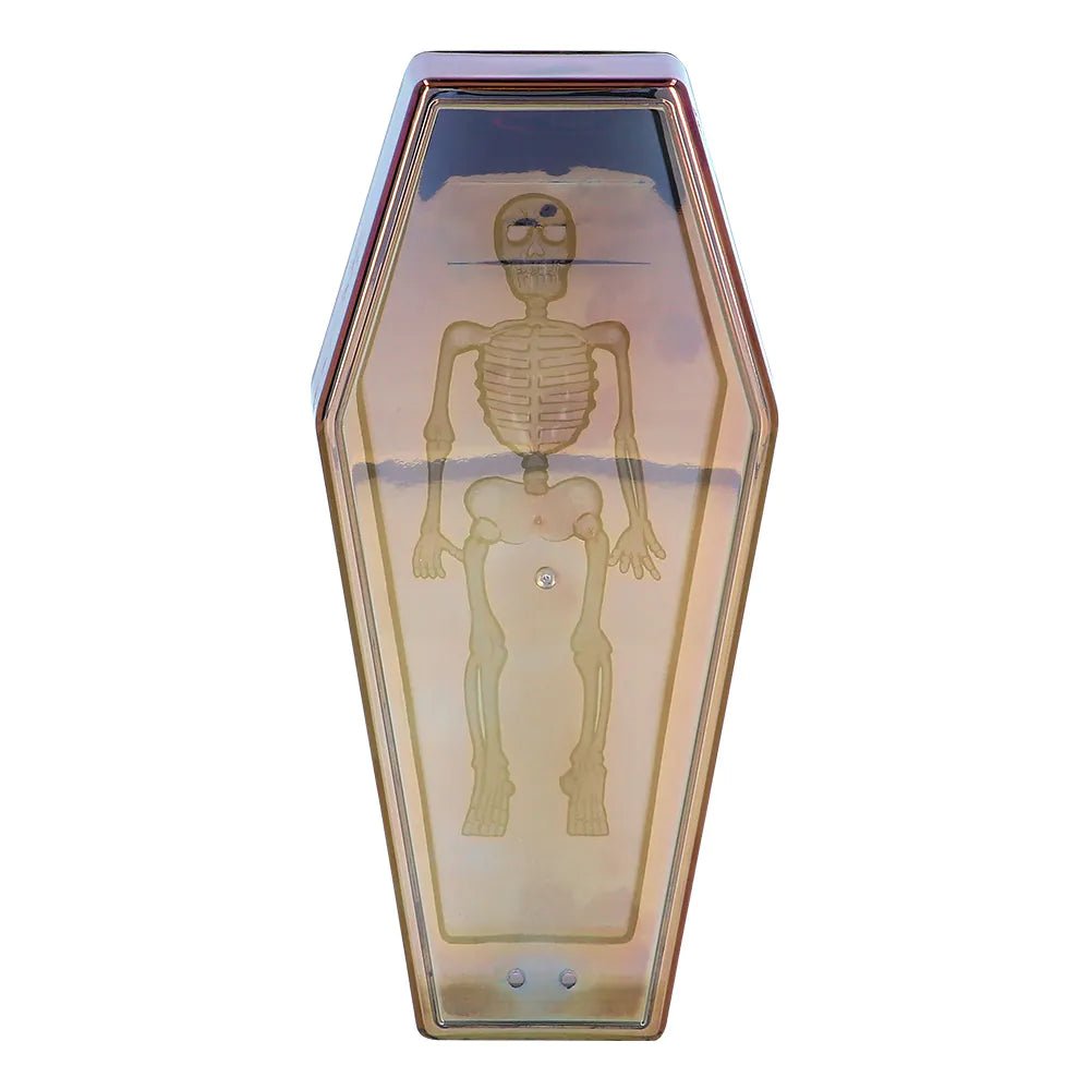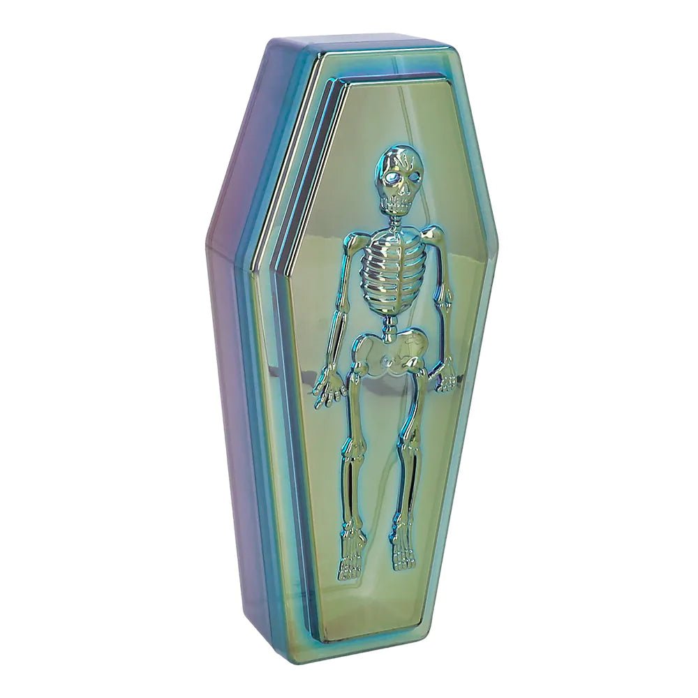 Denne farverige kiste på 19 cm er for sej som dekoration til en uhyggelig halloweenfest. Kisten er dekoreret med et relief af et skelet, hvilket gør den til et ægte blikfang. Flot at kombinere med nogle kranier og skeletter.