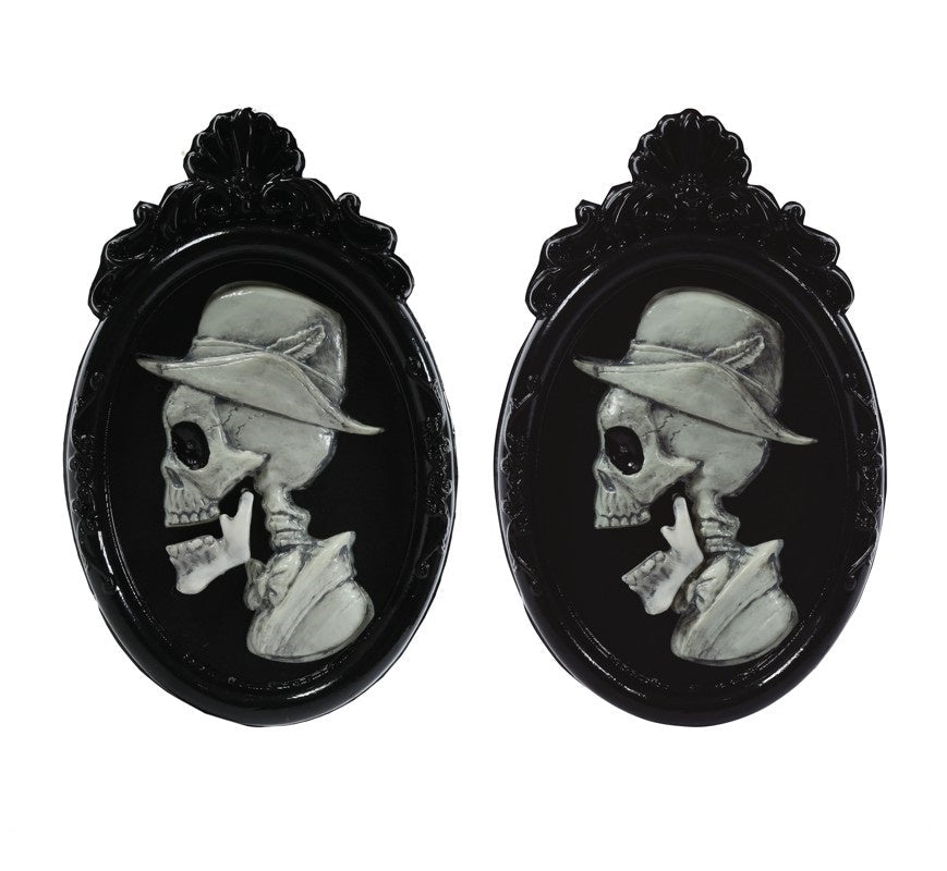 Giv din halloweenindgang et skræmmende look med dette 45 cm store dørskilt med kranieportræt. Basrelieffet i form af en buste med kranium med LED-lys i øjnene, bevægelig kæbe og klaprende tænder skaber øjeblikkeligt en uhyggelig og iøjnefaldende indgang.